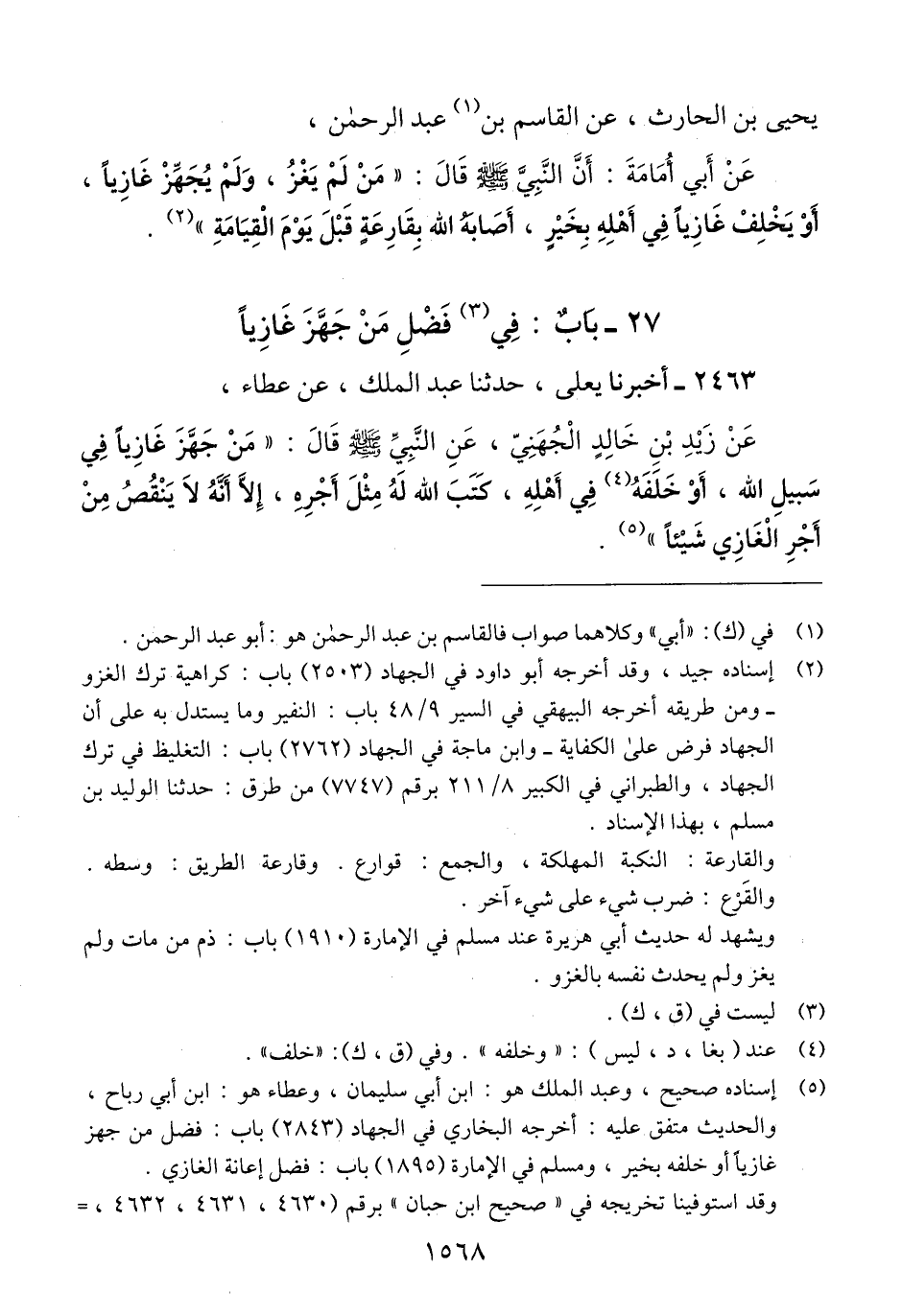 2463 - أَخْبَرَنَا يَعْلَى، حَدَّثَنَا عَبْدُ الْمَلِكِ، عَنْ عَطَاءٍ، عَنْ زَيْدِ بْنِ خَالِدٍ الْجُهَنِيِّ، عَنِ النَّبِيِّ صَلَّى اللهُ عَلَيْهِ وَسَلَّمَ قَالَ: «§مَنْ جَهَّزَ غَازِيًا فِي سَبِيلِ اللَّهِ، أَوْ خَلَفَهُ فِي أَهْلِهِ كَتَبَ اللَّهُ لَهُ، مِثْلَ أَجْرِهِ إِلَّا أَنَّهُ لَا يَنْقُصُ مِنْ أَجْرِ الْغَازِي شَيْئًا» Qإسناده صحيح وعبد الملك هو: ابن أبي سليمان وعطاء هو: ابن أبي رباح والحديث متفق عليه