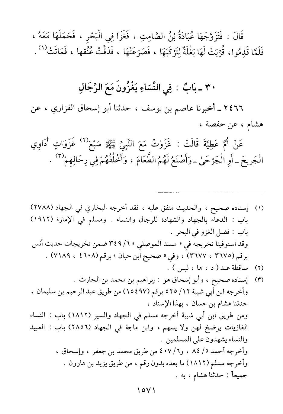 2466 - أَخْبَرَنَا عَاصِمُ بْنُ يُوسُفَ، حَدَّثَنَا أَبُو إِسْحَاقَ الْفَزَارِيُّ، عَنْ هِشَامٍ، عَنْ حَفْصَةَ، عَنْ أُمِّ عَطِيَّةَ، قَالَتْ: «§غَزَوْتُ مَعَ النَّبِيِّ صَلَّى اللهُ عَلَيْهِ وَسَلَّمَ، سَبْعَ غَزَوَاتٍ أُدَاوِي الْجَرِيحَ - أَوِ الْجَرْحَى -، وَأَصْنَعُ لَهُمُ الطَّعَامَ، وَأَخْلُفُهُمْ فِي رِحَالِهِمْ» Qإسناده صحيح وأبو إسحاق هو: إبراهيم بن محمد بن الحارث