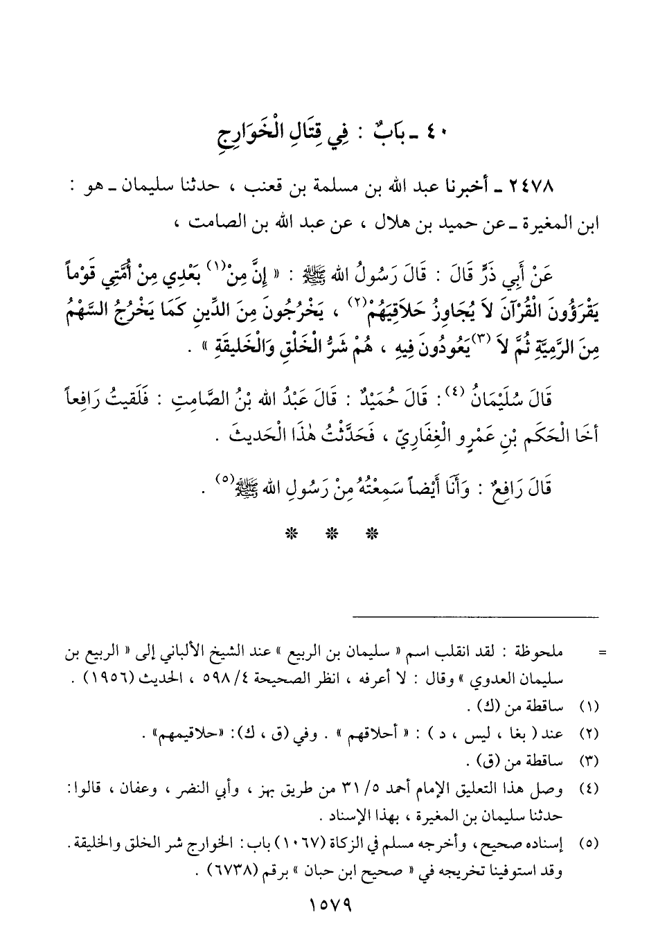 2478 - أَخْبَرَنَا عَبْدُ اللَّهِ بْنُ مَسْلَمَةَ بْنِ قَعْنَبٍ، حَدَّثَنَا سُلَيْمَانُ هُوَ ابْنُ الْمُغِيرَةِ، عَنْ حُمَيْدِ بْنِ هِلَالٍ، عَنْ عَبْدِ اللَّهِ بْنِ الصَّامِتِ، عَنْ أَبِي ذَرٍّ، قَالَ: قَالَ رَسُولُ اللَّهِ صَلَّى اللهُ عَلَيْهِ وَسَلَّمَ: «§إِنَّ مِنْ بَعْدِي مِنْ أُمَّتِي قَوْمًا يَقْرَءُونَ الْقُرْآنَ لَا يُجَاوِزُ حَلَاقِيمَهُمْ، يَخْرُجُونَ مِنَ الدِّينِ كَمَا يَخْرُجُ السَّهْمُ مِنَ الرَّمِيَّةِ، ثُمَّ لَا يَعُودُونَ فِيهِ، هُمْ شَرُّ الْخَلْقِ وَالْخَلِيقَةِ» قَالَ سُلَيْمَانُ قَالَ حُمَيْدٌ قَالَ عَبْدُ اللَّهِ بْنُ الصَّامِتِ: فَلَقِيتُ رَافِعًا أَخَا الْحَكَمِ بْنِ عَمْرٍو الْغِفَارِيِّ فَحَدَّثْتُ هَذَا الْحَدِيثَ. قَالَ رَافِعٌ وَأَنَا أَيْضًا سَمِعْتُهُ مِنْ رَسُولِ اللَّهِ صَلَّى اللهُ عَلَيْهِ وَسَلَّمَQإسناده صحيح