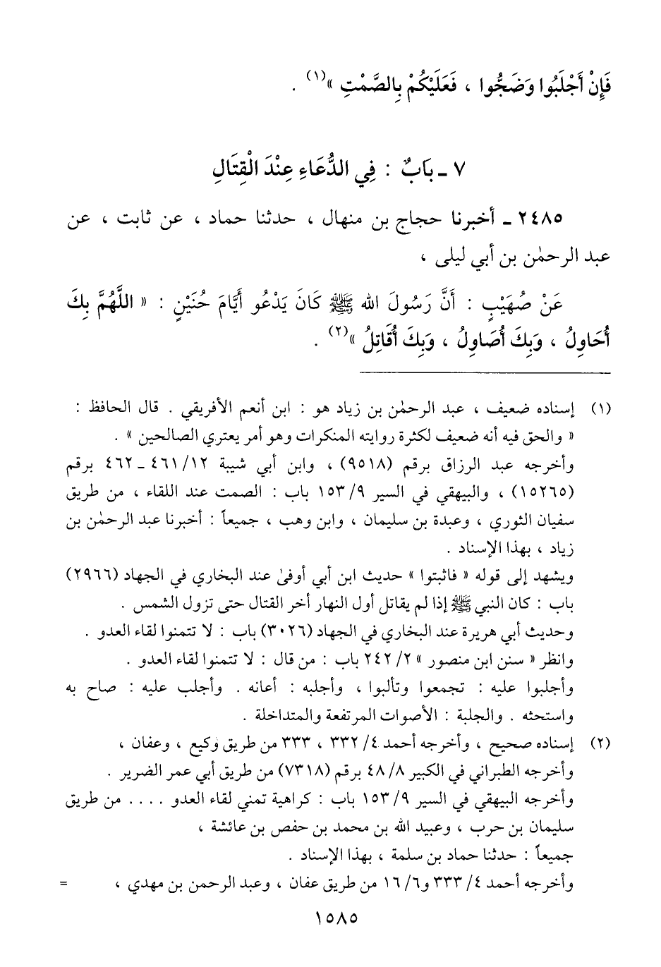 2485 - أَخْبَرَنَا حَجَّاجُ بْنُ مِنْهَالٍ، حَدَّثَنَا حَمَّادٌ، عَنْ ثَابِتٍ، عَنْ عَبْدِ الرَّحْمَنِ بْنِ أَبِي لَيْلَى، عَنْ صُهَيْبٍ، أَنَّ رَسُولَ اللَّهِ صَلَّى اللهُ عَلَيْهِ وَسَلَّمَ، كَانَ يَدْعُو أَيَّامَ حُنَيْنٍ «§اللَّهُمَّ بِكَ أُحَاوِلُ وَبِكَ أُصَاوِلُ وَبِكَ أُقَاتِلُ» Qإسناده صحيح