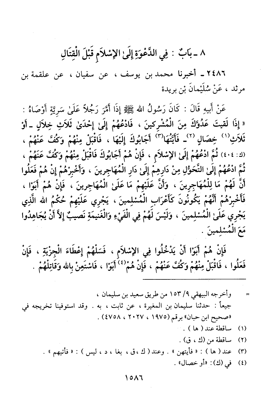 2486 - أَخْبَرَنَا مُحَمَّدُ بْنُ يُوسُفَ، عَنْ سُفْيَانَ، عَنْ عَلْقَمَةَ بْنِ مَرْثَدٍ، عَنْ سُلَيْمَانَ بْنِ بُرَيْدَةَ، عَنْ أَبِيهِ، قَالَ كَانَ رَسُولُ اللَّهِ صَلَّى اللهُ عَلَيْهِ وَسَلَّمَ، أَمَّرَ رَجُلًا عَلَى سَرِيَّةٍ أَوْصَاهُ: «§إِذَا لَقِيتَ عَدُوَّكَ مِنَ الْمُشْرِكِينَ، فَادْعُهُمْ إِلَى إِحْدَى ثَلَاثِ خِلَالٍ - أَوْ ثَلَاثِ خِصَالٍ -، فَأَيَّتُهُمْ مَا أَجَابُوكَ إِلَيْهَا، فَاقْبَلْ مِنْهُمْ وَكُفَّ عَنْهُمْ، ثُمَّ ادْعُهُمْ إِلَى الْإِسْلَامِ، فَإِنْ هُمْ أَجَابُوكَ فَاقْبَلْ مِنْهُمْ وَكُفَّ عَنْهُمْ، ثُمَّ ادْعُهُمْ إِلَى التَّحَوُّلِ مِنْ دَارِهِمْ إِلَى دَارِ الْمُهَاجِرِينَ، وَأَخْبِرْهُمْ إِنْ هُمْ فَعَلُوا أَنَّ لَهُمْ مَا لِلْمُهَاجِرِينَ، وَأَنَّ عَلَيْهِمْ مَا عَلَى الْمُهَاجِرِينَ، فَإِنْ هُمْ أَبَوْا، فَأَخْبِرْهُمْ أَنَّهُمْ يَكُونُونَ كَأَعْرَابِ الْمُسْلِمِينَ، يَجْرِي عَلَيْهِمْ حُكْمُ اللَّهِ الَّذِي يَجْرِي عَلَى الْمُسلمين وَلَيْسَ لَهُمْ فِي الْفَيْءِ وَالْغَنِيمَةِ نَصِيبٌ إِلَّا أَنْ يُجَاهِدُوا مَعَ الْمُسْلِمِينَ. فَإِنْ هُمْ أَبَوْا أَنْ يَدْخُلُوا فِي الْإِسْلَامِ، فَسَلْهُمْ إِعْطَاءَ الْجِزْيَةِ، فَإِنْ فَعَلُوا، فَاقْبَلْ مِنْهُمْ وَكُفَّ عَنْهُمْ، فَإِنْ هُمْ أَبَوْا، فَاسْتَعِنْ بِاللَّهِ وَقَاتِلْهُمْ. -[1587]- وَإِنْ حَاصَرْتَ أَهْلَ حِصْنٍ، فَإِنْ أَرَادُوكَ أَنْ تَجْعَلَ لَهُمْ ذِمَّةَ اللَّهِ وَذِمَّةَ نَبِيِّهِ فَلَا تَجْعَلْ لَهُمْ ذِمَّةَ اللَّهِ، وَلَا ذِمَّةَ نَبِيِّهِ، وَلَكِنِ اجْعَلْ لَهُمْ ذِمَّتَكَ وَذِمَّةَ أَبِيكَ، وَذِمَّةَ أَصْحَابِكَ، فَإِنَّكُمْ إِنْ تُخْفِرُوا ذِمَّتَكُمْ وَذِمَّةَ آبَائِكُمْ أَهْوَنُ عَلَيْكُمْ مِنْ أَنْ تُخْفِرُوا ذِمَّةَ اللَّهِ وَذِمَّةَ رَسُولِهِ. وَإِنْ حَاصَرْتَ حِصْنًا فَأَرَادُوكَ أَنْ يَنْزِلُوا عَلَى حُكْمِ اللَّهِ، فَلَا تُنْزِلْهُمْ عَلَى حُكْمِ اللَّهِ، وَلَكِنْ أَنْزِلْهُمْ عَلَى حُكْمِكَ فَإِنَّكَ لَا تَدْرِي أَتُصِيبُ حُكْمَ اللَّهِ فِيهِمْ أَمْ لَا، ثُمَّ اقْضِ فِيهِمْ بِمَا شِئْتَ» Qإسناده صحيح