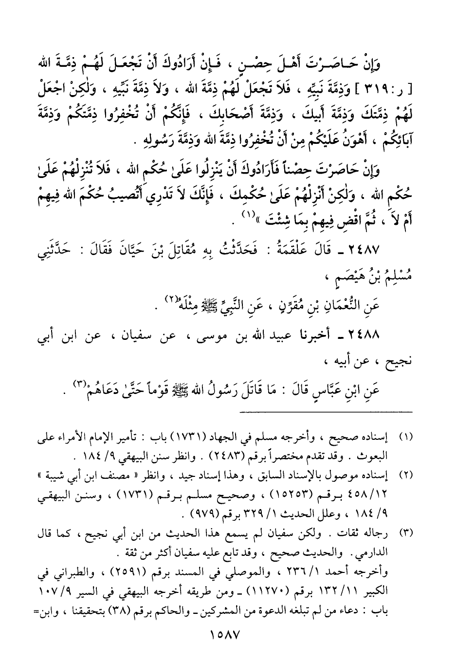 2488 - أَخْبَرَنَا عُبَيْدُ اللَّهِ بْنُ مُوسَى، عَنْ سُفْيَانَ، عَنْ ابْنِ أَبِي نَجِيحٍ، عَنْ أَبِيهِ، عَنْ ابْنِ عَبَّاسٍ، قَالَ: «§مَا قَاتَلَ رَسُولُ اللَّهِ صَلَّى اللهُ عَلَيْهِ وَسَلَّمَ، قَوْمًا حَتَّى دَعَاهُمْ» -[1588]- قَالَ عَبْد اللَّهِ: سُفْيَانُ لَمْ يَسْمَعْ مِنْ ابْنِ أَبِي نَجِيحٍ يَعْنِي هَذَا الْحَدِيثَQرجاله ثقات. ولكن سفيان لم يسمع هذا الحديث من ابن أبي نجيح كما قال الدرامي. والحديث صحيح