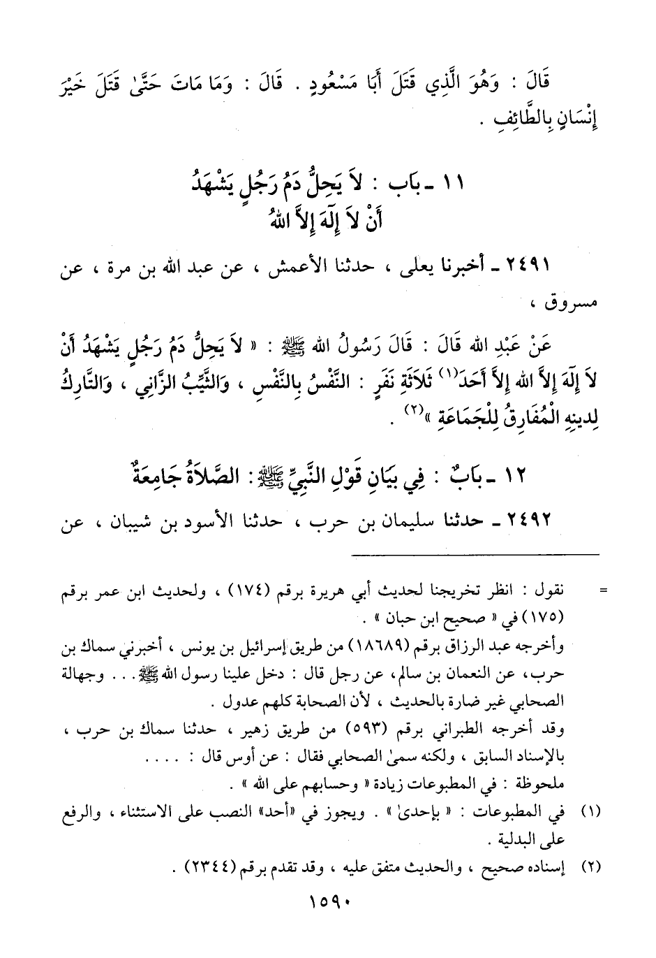 2491 - أَخْبَرَنَا يَعْلَى، حَدَّثَنَا الْأَعْمَشُ، عَنْ عَبْدِ اللَّهِ بْنِ مُرَّةَ، عَنْ مَسْرُوقٍ، عَنْ عَبْدِ اللَّهِ، قَالَ: قَالَ رَسُولُ اللَّهِ صَلَّى اللهُ عَلَيْهِ وَسَلَّمَ: " §لَا يَحِلُّ دَمُ رَجُلٍ يَشْهَدُ أَنْ لَا إِلَهَ إِلَّا اللَّهُ إِلَّا إِحْدَى ثَلَاثَةِ نَفَرٍ: النَّفْسُ بِالنَّفْسِ، وَالثَّيِّبُ الزَّانِي، وَالتَّارِكُ لِدِينِهِ الْمُفَارِقُ لِلْجَمَاعَةِ "Qإسناده صحيح والحديث متفق عليه