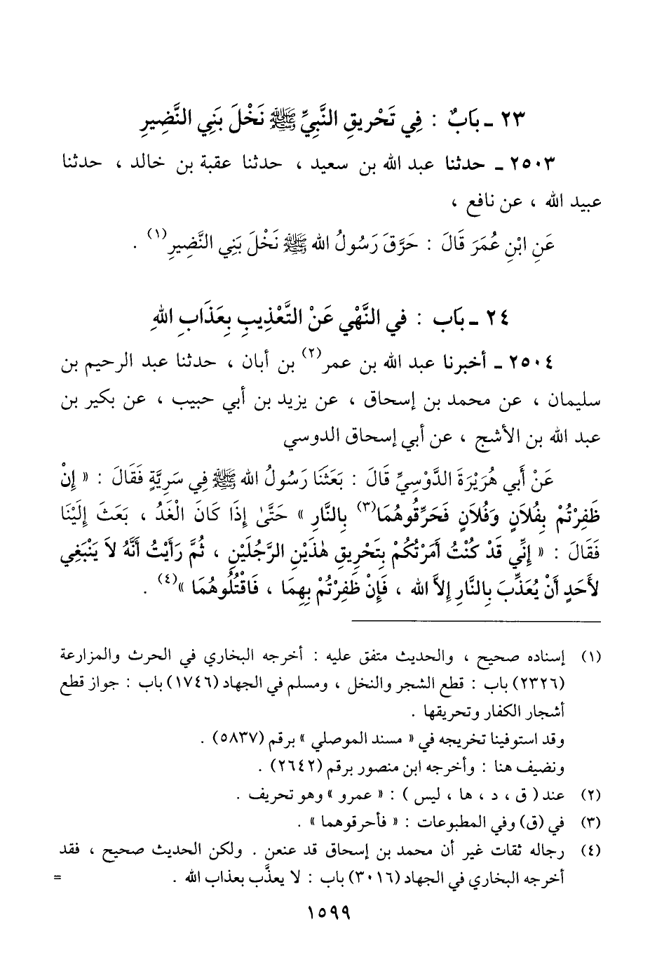 2504 - أَخْبَرَنَا عَبْدُ اللَّهِ بْنُ عُمَرَ بْنِ أَبَانَ، حَدَّثَنَا عَبْدُ الرَّحِيمِ بْنُ سُلَيْمَانَ، عَنْ مُحَمَّدِ بْنِ إِسْحَاقَ، عَنْ يَزِيدَ بْنِ أَبِي حَبِيبٍ، عَنْ بُكَيْرِ بْنِ عَبْدِ اللَّهِ بْنِ الْأَشَجِّ، عَنْ أَبِي إِسْحَاقَ الدَّوْسِيِّ، عَنْ أَبِي هُرَيْرَةَ الدَّوْسِيِّ، قَالَ: بَعَثَنَا رَسُولُ اللَّهِ صَلَّى اللهُ عَلَيْهِ وَسَلَّمَ، فِي سَرِيَّةٍ فَقَالَ: «إِنْ ظَفِرْتُمْ بِفُلَانٍ وَفُلَانٍ فَحَرِّقُوهُمَا بِالنَّارِ» حَتَّى إِذَا كَانَ الْغَدُ، بَعَثَ إِلَيْنَا فَقَالَ: «إِنِّي §كُنْتُ أَمَرْتُكُمْ بِتَحْرِيقِ هَذَيْنِ الرَّجُلَيْنِ، ثُمَّ رَأَيْتُ أَنَّهُ لَا يَنْبَغِي لِأَحَدٍ أَنْ يُعَذِّبَ بِالنَّارِ إِلَّا اللَّهُ، فَإِنْ ظَفِرْتُمْ بِهِمَا، فَاقْتُلُوهُمَا» Qرجاله ثقات غير أن محمد بن اسحاق قد عنعن. ولكن الحديث صحيح