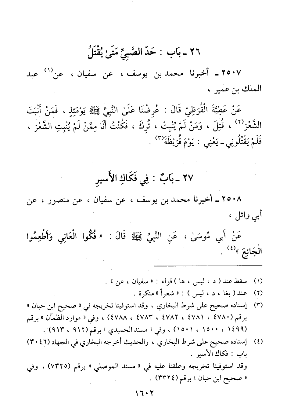 2508 - أَخْبَرَنَا مُحَمَّدُ بْنُ يُوسُفَ، عَنْ سُفْيَانَ، عَنْ مَنْصُورٍ، عَنْ أَبِي وَائِلٍ، عَنْ أَبِي مُوسَى، عَنِ النَّبِيِّ صَلَّى اللهُ عَلَيْهِ وَسَلَّمَ قَالَ: «§فُكُّوا الْعَانِيَ، وَأَطْعِمُوا الْجَائِعَ» Qإسناده صحيح على شرط البخاري