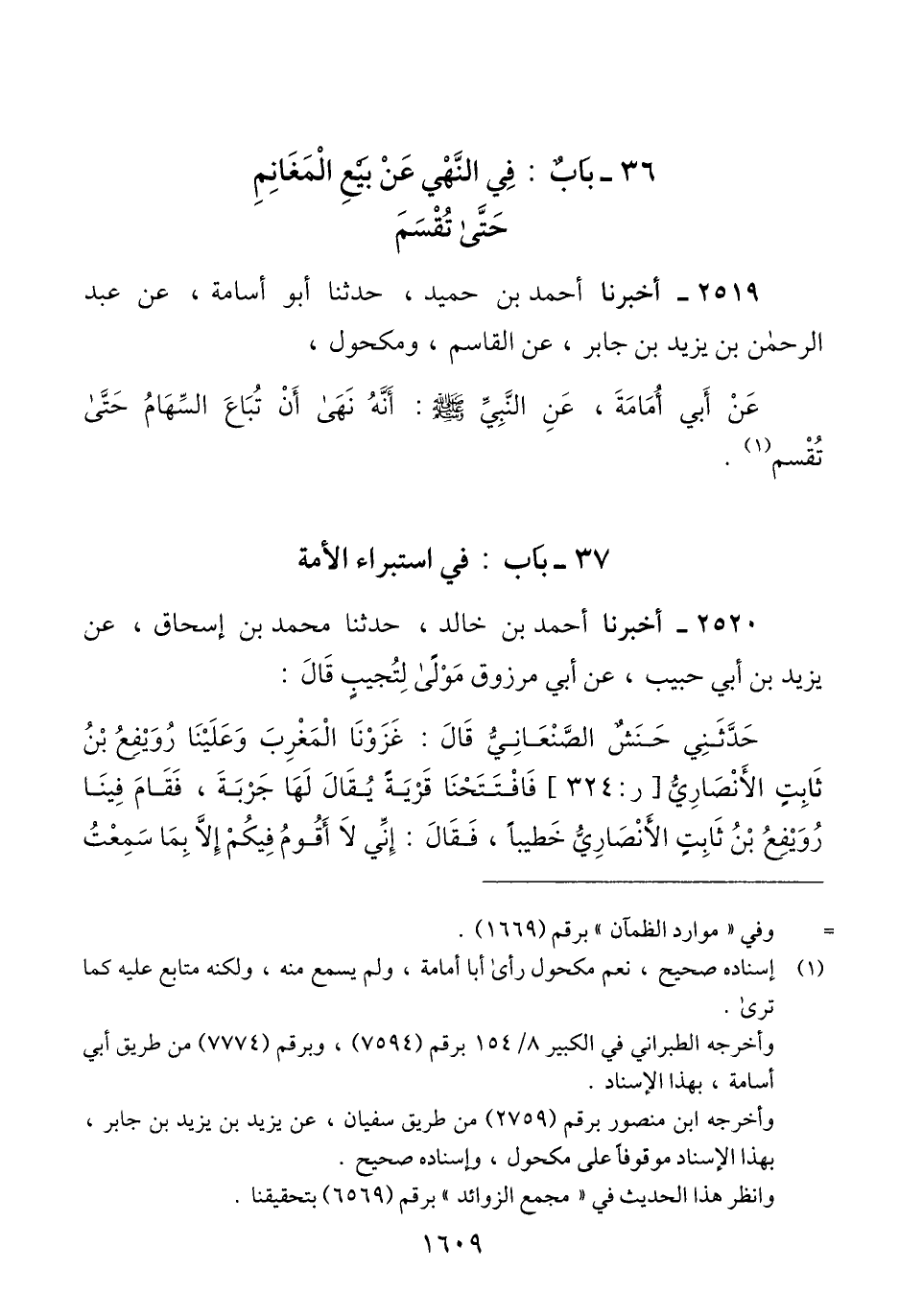 2519 - أَخْبَرَنَا أَحْمَدُ بْنُ حُمْيَدٍ، حَدَّثَنَا أَبُو أُسَامَةَ، عَنْ عَبْدِ الرَّحْمَنِ بْنِ يَزِيدَ بْنِ جَابِرٍ، عَنْ الْقَاسِمِ، وَمَكْحُولٍ، عَنْ أَبِي أُمَامَةَ، عَنِ النَّبِيِّ صَلَّى اللهُ عَلَيْهِ وَسَلَّمَ، أَنَّهُ نَهَى أَنْ §تُبَاعَ السِّهَامُ حَتَّى تُقْسَمَQإسناده صحيح نعم مكحول رأى أبا أمامة ولم يسمع منه ولكنه متابع عليه كما ترى