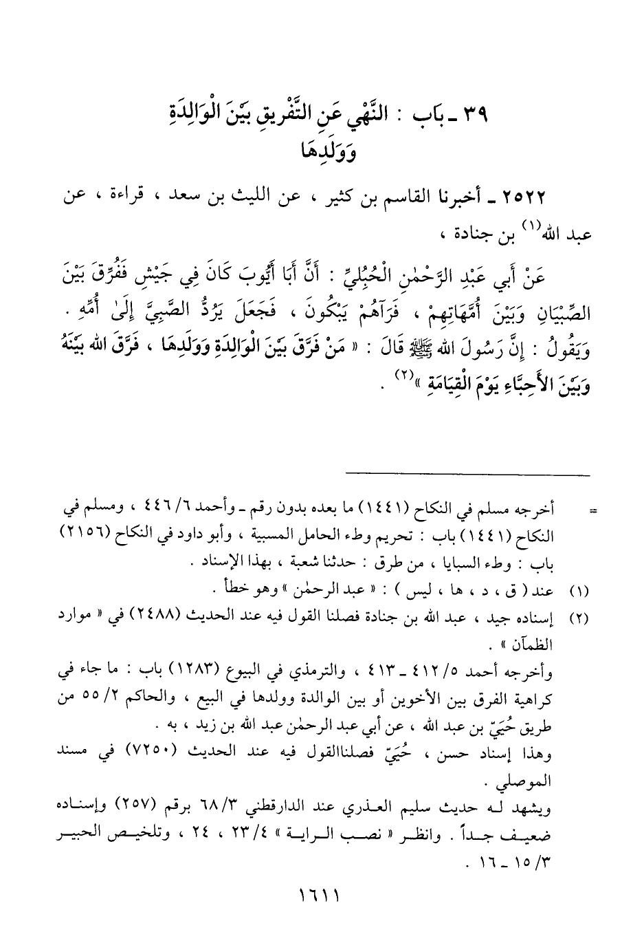 2522 - أَخْبَرَنَا الْقَاسِمُ بْنُ كَثِيرٍ، عَنْ اللَّيْثِ بْنِ سَعْدٍ، قِرَاءَةً، عَنْ عَبْدِ اللَّهِ بْنِ جُنَادَةَ، عَنْ أَبِي عَبْدِ الرَّحْمَنِ الْحُبُلِىِّ: أَنَّ أَبَا أَيُّوبَ كَانَ فِي جَيْشٍ فَفُرِّقَ بَيْنَ الصِّبْيَانِ وَبَيْنَ أُمَّهَاتِهِمْ، فَرَآهُمْ يَبْكُونَ، فَجَعَلَ يَرُدُّ الصَّبِيَّ إِلَى أُمِّهِ. وَيَقُولُ: إِنَّ رَسُولَ اللَّهِ صَلَّى اللهُ عَلَيْهِ وَسَلَّمَ قَالَ: «§مَنْ فَرَّقَ بَيْنَ الْوَالِدَةِ وَوَلَدِهَا، فَرَّقَ اللَّهُ بَيْنَهُ وَبَيْنَ الْأَحِبَّاءِ يَوْمَ الْقِيَامَةِ» Qإسناده جيد