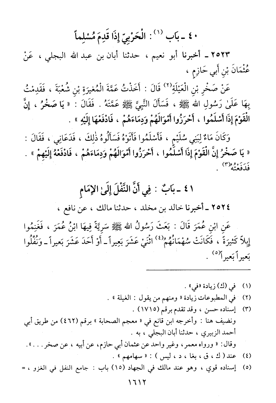 2524 - أَخْبَرَنَا خَالِدُ بْنُ مَخْلَدٍ، حَدَّثَنَا مَالِكٌ، عَنْ نَافِعٍ، عَنْ ابِنِ عُمَرَ، قَالَ: «§بَعَثَ رَسُولُ اللَّهِ صَلَّى اللهُ عَلَيْهِ وَسَلَّمَ، سَرِيَّةً فِيهَا ابْنُ عُمَرَ فَغَنِمُوا إِبِلًا كَثِيرَةً، فَكَانَتْ سُهْمَانُهُمُ اثْنَيْ عَشَرَ بَعِيرًا - أَوْ أَحَدَ عَشَرَ بَعِيرًا - وَنُفِّلُوا بَعِيرًا بَعِيرًا» Qإسناده قوي