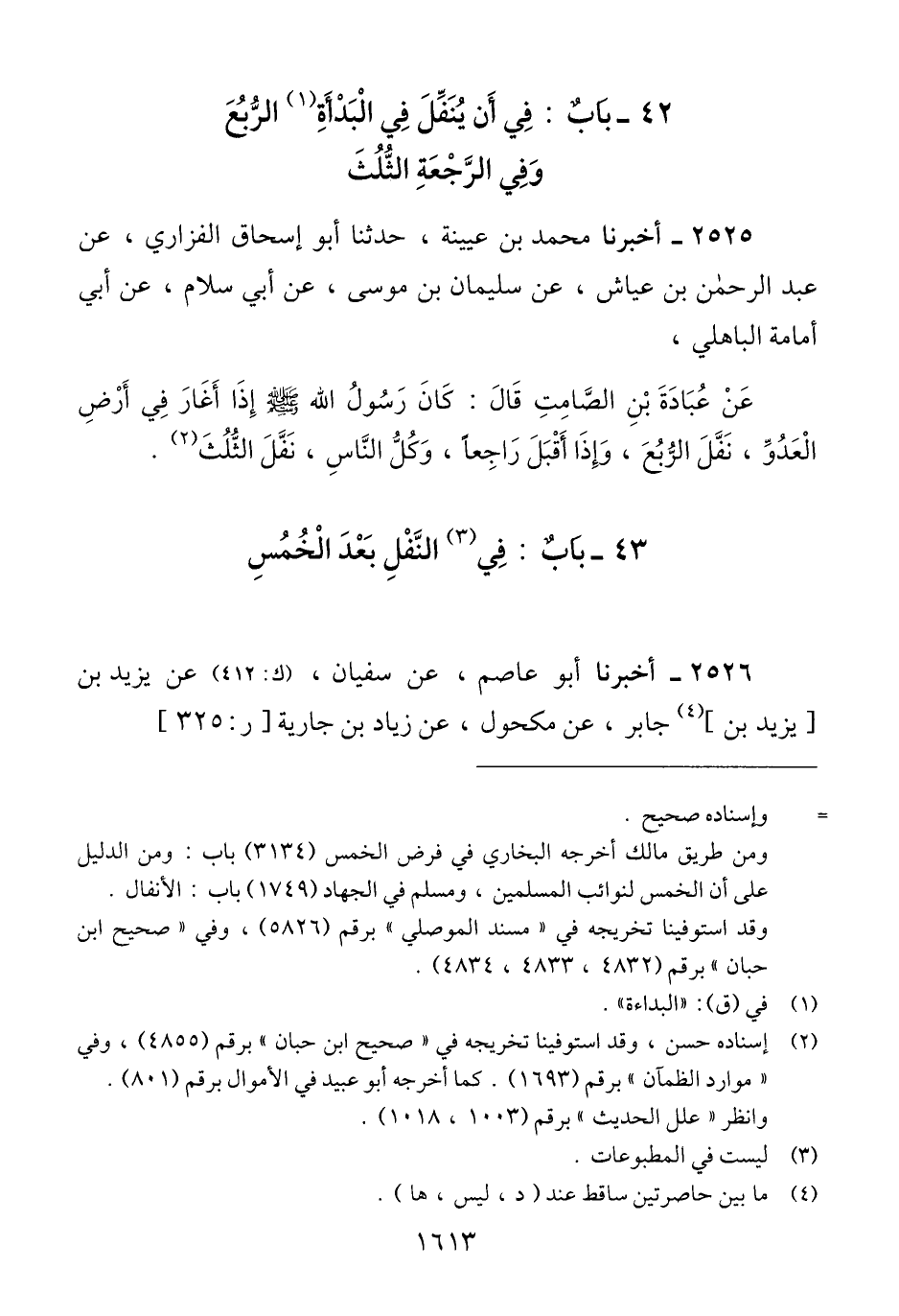 2525 - أَخْبَرَنَا مُحَمَّدُ بْنُ عُيَيْنَةَ، حَدَّثَنَا أَبُو إِسْحَاقَ الْفَزَارِيُّ، عَنْ عَبْدِ الرَّحْمَنِ بْنِ عَيَّاشٍ، عَنْ سُلَيْمَانَ بْنِ مُوسَى، عَنْ أَبِي سَلَّامٍ، عَنْ أَبِي أُمَامَةَ الْبَاهِلِيِّ، عَنْ عُبَادَةَ بْنِ الصَّامِتِ، قَالَ: «كَانَ رَسُولُ اللَّهِ صَلَّى اللهُ عَلَيْهِ وَسَلَّمَ، §إِذَا أَغَارَ فِي أَرْضِ الْعَدُوِّ نَفَّلَ الرُّبُعَ، وَإِذَا أَقْبَلَ رَاجِعًا وَكَلَّ النَّاسُ نَفَّلَ الثُّلُثَ» Qإسناده حسن