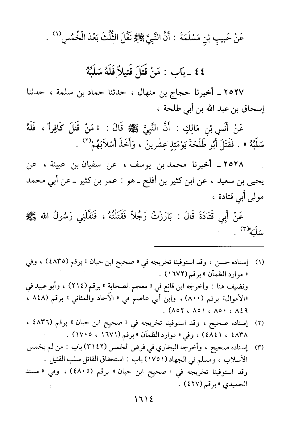 2528 - أَخْبَرَنَا مُحَمَّدُ بْنُ يُوسُفَ، عَنْ سُفْيَانَ بْنِ عُيَيْنَةَ، عَنْ يَحْيَى بْنِ سَعِيدٍ، عَنْ ابْنِ كَثِيرِ بْنِ أَفْلَحَ، هُوَ عُمَرُ بْنُ كَثِيرٍ عَنْ أَبِي مُحَمَّدٍ، مَوْلَى أَبِي قَتَادَةَ عَنْ أَبِي قَتَادَةَ، قَالَ: «§بَارَزْتُ رَجُلًا فَقَتَلْتُهُ فَنَفَّلَنِي رَسُولُ اللَّهِ صَلَّى اللهُ عَلَيْهِ وَسَلَّمَ، سَلَبَهُ» Qإسناده صحيح