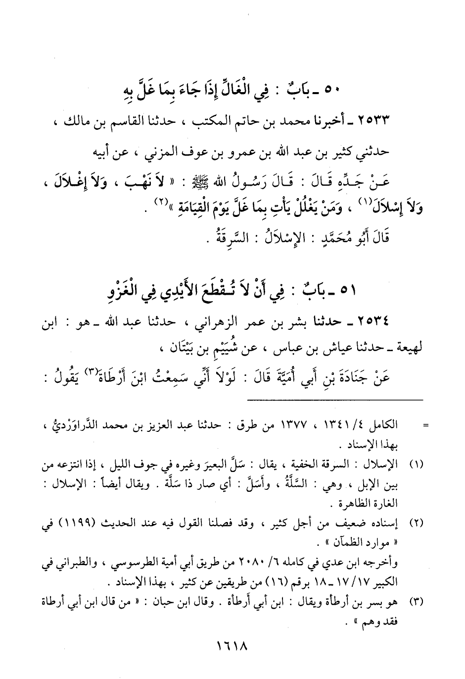 2533 - أَخْبَرَنَا مُحَمَّدُ بْنُ حَاتِمٍ الْمُكْتِبُ، حَدَّثَنَا الْقَاسِمُ بْنُ مَالِكٍ، حَدَّثَنِي كَثِيرُ بْنُ عَبْدِ اللَّهِ بْنِ عَمْرِو بْنِ عَوْفٍ الْمُزَنِيُّ، عَنْ أَبِيهِ، عَنْ جَدِّهِ، قَالَ: قَالَ رَسُولُ اللَّهِ صَلَّى اللهُ عَلَيْهِ وَسَلَّمَ: " §لَا نَهْبَ، وَلَا إِغْلَالَ، وَلَا إِسْلَالَ، {وَمَنْ يَغْلُلْ يَأْتِ بِمَا غَلَّ يَوْمَ الْقِيَامَةِ} [آل عمران: 161] "، قَالَ أَبُو مُحَمَّد: " الْإِسْلَالُ: السَّرِقَةُ "Qإسناده ضعيف من أجل كثير
