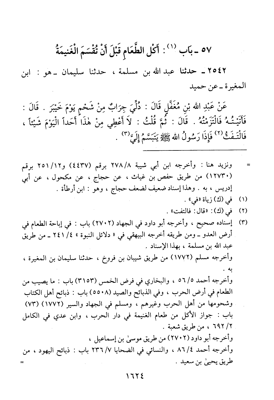 2542 - حَدَّثَنَا عَبْدُ اللَّهِ بْنُ مَسْلَمَةَ، حَدَّثَنَا سُلَيْمَانُ هُوَ ابْنُ الْمُغِيرَةِ، عَنْ حُمَيْدٍ، عَنْ عَبْدِ اللَّهِ بْنِ مُغَفَّلٍ، قَالَ: " §دُلِّيَ جِرَابٌ مِنْ شَحْمٍ يَوْمَ خَيْبَرَ، قَالَ: فَأَتَيْتُهُ فَالْتَزَمْتُهُ، قَالَ: ثُمَّ قُلْتُ: لَا أُعْطِي مِنْ هَذَا أَحَدًا الْيَوْمَ شَيْئًا، فَالْتَفَتُّ، فَإِذَا رَسُولُ اللَّهِ صَلَّى اللهُ عَلَيْهِ وَسَلَّمَ، يَبْتَسِمُ إِلَيَّ "، -[1625]- قَالَ عَبْد اللَّهِ: «أَرْجُو أَنْ يَكُونَ حُمَيْدٌ سَمِعَ مِنْ عَبْدِ اللَّهِ» Qإسناده صحيح