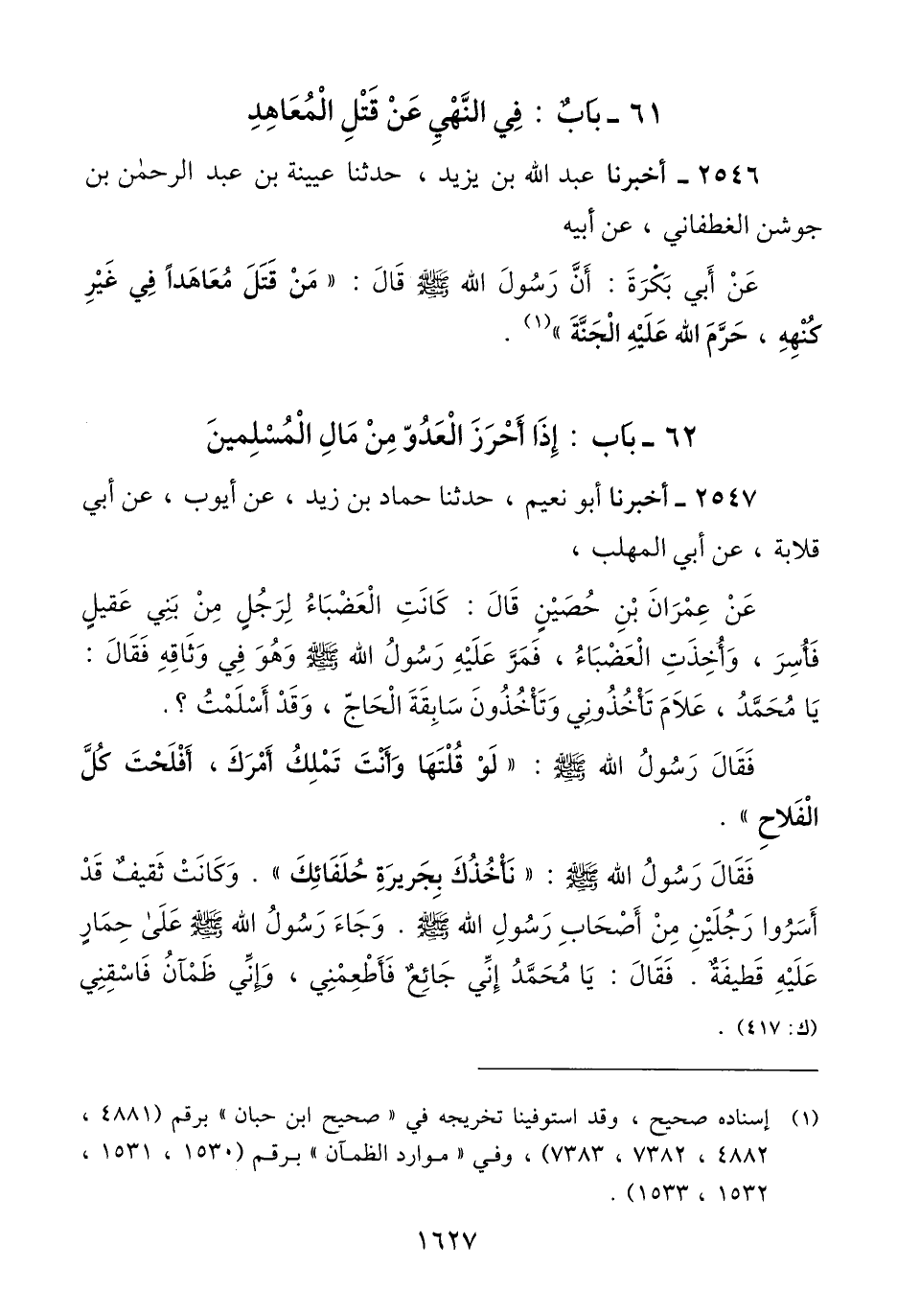 2546 - أَخْبَرَنَا عَبْدُ اللَّهِ بْنُ يَزِيدَ، حَدَّثَنَا عُيَيْنَةُ بْنُ عَبْدِ الرَّحْمَنِ بْنِ جَوْشَنٍ الْغَطَفَانِيُّ، عَنْ أَبِيهِ، عَنْ أَبِي بَكْرَةَ، أَنَّ رَسُولَ اللَّهِ صَلَّى اللهُ عَلَيْهِ وَسَلَّمَ قَالَ: «§مَنْ قَتَلَ مُعَاهَدًا فِي غَيْرِ كُنْهِهِ، حَرَّمَ اللَّهُ عَلَيْهِ الْجَنَّةَ» Qإسناده صحيح