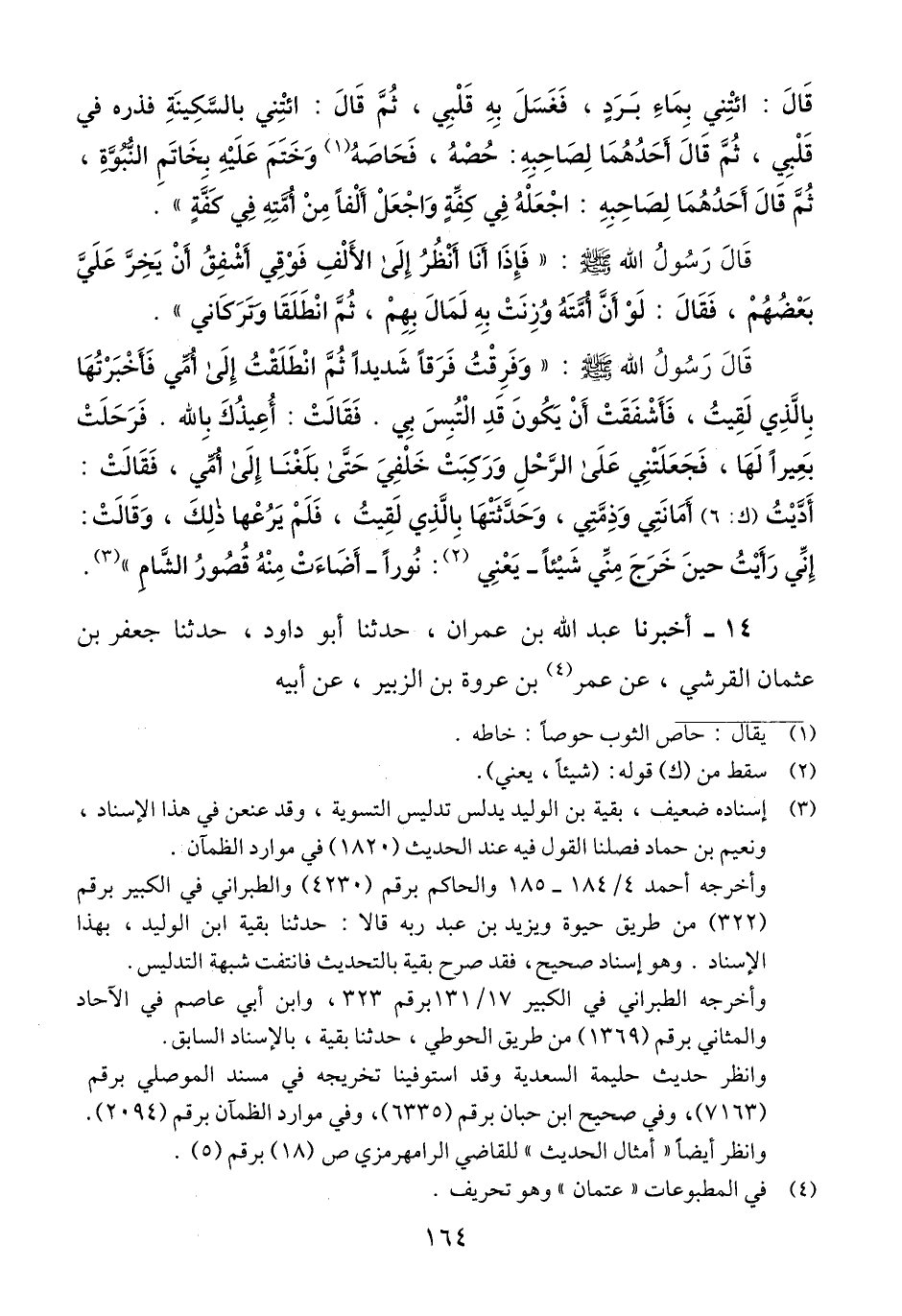 14 - أَخْبَرَنَا عَبْدُ اللَّهِ بْنُ عِمْرَانَ، حَدَّثَنَا أَبُو دَاوُدَ، حَدَّثَنَا جَعْفَرُ بْنُ عُثْمَانَ الْقُرَشِيُّ، عَنْ عُمَرَ بْنِ عُرْوَةَ بْنِ الزُّبَيْرِ، عَنْ أَبِيهِ، -[165]- عَنْ أَبِي ذَرٍّ الْغِفَارِيِّ رَضِيَ اللَّهُ عَنْهُ، قَالَ قُلْتُ: يَا رَسُولَ اللَّهِ كَيْفَ عَلِمْتَ أَنَّكَ نَبِيٌّ حَتَّى اسْتَيْقَنْتَ؟ فَقَالَ: " يَا أَبَا ذَرٍّ §أَتَانِي مَلَكَانِ وَأَنَا بِبَعْضِ بَطْحَاءِ مَكَّةَ فَوَقَعَ أَحَدُهُمَا عَلَى الْأَرْضِ، وَكَانَ الْآخَرُ بَيْنَ السَّمَاءِ وَالْأَرْضِ، فَقَالَ أَحَدُهُمَا لِصَاحِبِهِ: أَهُوَ هُوَ؟ قَالَ: نَعَمْ، قَالَ زِنْهُ بِرَجُلٍ، فَوُزِنْتُ بِهِ فَوَزَنْتُهُ، ثُمَّ قَالَ: فَزِنْهُ بِعَشَرَةٍ، فَوُزِنْتُ بِهِمْ فَرَجَحْتُهُمْ، ثُمَّ قَالَ: زِنْهُ بِمِائَةٍ، فَوُزِنْتُ بِهِمْ فَرَجَحْتُهُمْ ثُمَّ قَالَ: زِنْهُ بِأَلْفٍ، فَوُزِنْتُ بِهِمْ فَرَجَحْتُهُمْ كَأَنِّي أَنْظُرُ إِلَيْهِمْ يَنْتَثِرُونَ عَلَيَّ مِنْ خِفَّةِ الْمِيزَانِ، قَالَ: فَقَالَ أَحَدُهُمَا لِصَاحِبِهِ: لَوْ وَزَنْتَهُ بِأُمَّتِهِ لَرَجَحَهَا "Qإسناده منقطع عروة بن الزبير لم يدرك أبا ذر الغفاري ورجاله ثقات