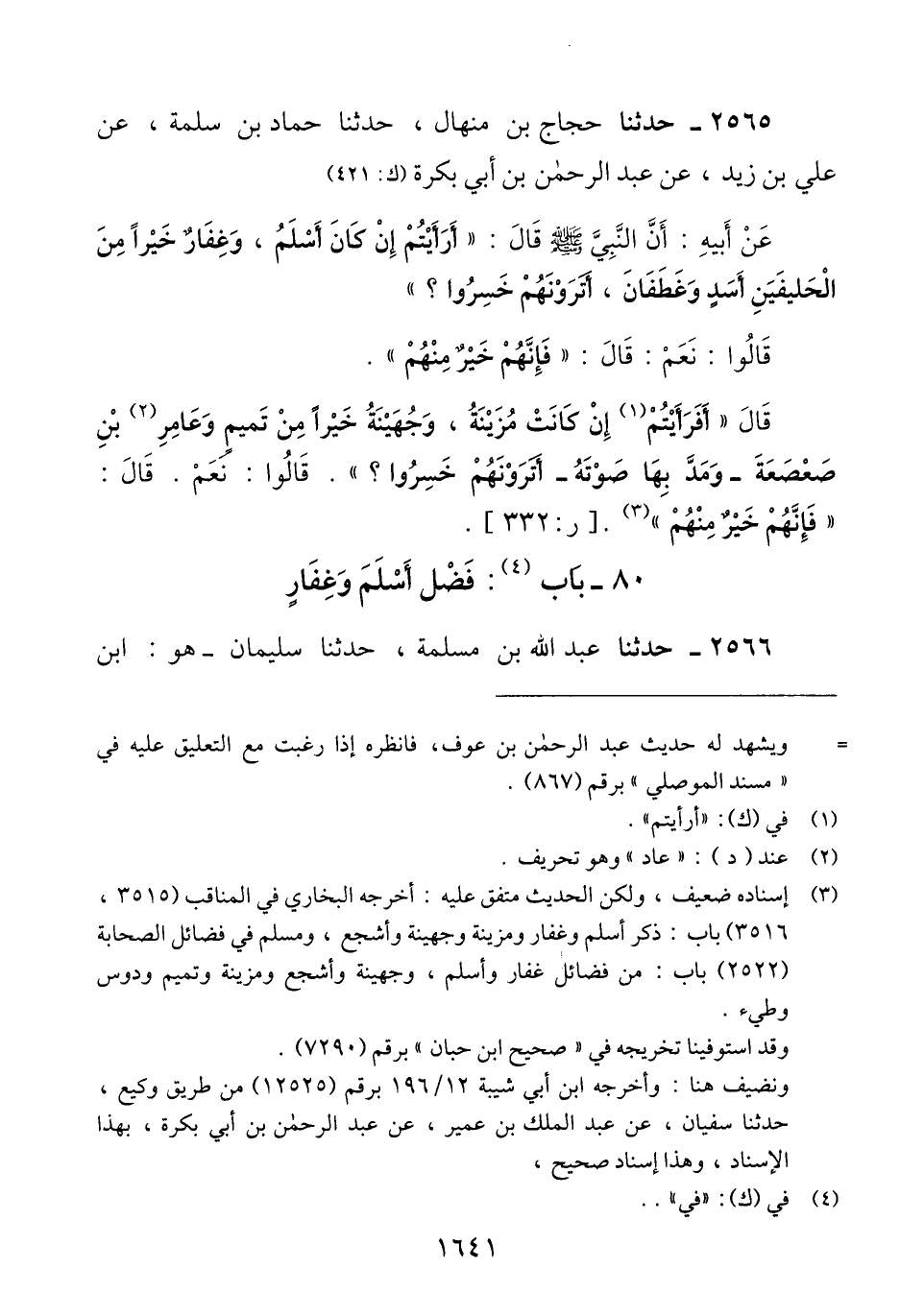 2565 - حَدَّثَنَا حَجَّاجُ بْنُ مِنْهَالٍ، حَدَّثَنَا حَمَّادُ بْنُ سَلَمَةَ، عَنْ عَلِيِّ بْنِ زَيْدٍ، عَنْ عَبْدِ الرَّحْمَنِ بْنِ أَبِي بَكْرَةَ، عَنْ أَبِيهِ، أَنَّ النَّبِيَّ صَلَّى اللهُ عَلَيْهِ وَسَلَّمَ قَالَ: «§أَرَأَيْتُمْ إِنْ كَانَ أَسْلَمُ وَغِفَارٌ خَيْرًا مِنَ الْحَلِيفَيْنِ أَسَدٍ وَغَطَفَانَ أَتُرَوْنَهُمْ خَسِرُوا؟» قَالُوا: نَعَمْ، قَالَ: «فَإِنَّهُمْ خَيْرٌ مِنْهُمْ»، قَالَ: «أَفَرَأَيْتُمْ إِنْ كَانَتْ مُزَيْنَةُ وَجُهَيْنَةُ خَيْرًا مِنْ تَمِيمٍ وَعَامِرِ بْنِ صَعْصَعَةَ - وَمَدَّ بِهَا صَوْتَهُ - أَتُرَوْنَهُمْ خَسِرُوا؟» قَالُوا: نَعَمْ، قَالَ: «فَإِنَّهُمْ خَيْرٌ مِنْهُمْ» Qإسناده ضعيف ولكن الحديث متفق عليه