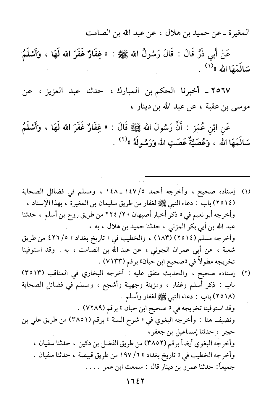 2567 - أَخْبَرَنَا الْحَكَمُ بْنُ الْمُبَارَكِ، حَدَّثَنَا عَبْدُ الْعَزِيزِ، عَنْ مُوسَى بْنِ عُقْبَةَ، عَنْ عَبْدِ اللَّهِ بْنِ دِينَارٍ، عَنْ ابْنِ عُمَرَ، أَنَّ رَسُولَ اللَّهِ صَلَّى اللهُ عَلَيْهِ وَسَلَّمَ قَالَ: «§غِفَارٌ غَفَرَ اللَّهُ لَهَا، وَأَسْلَمُ سَالَمَهَا اللَّهُ، وَعُصَيَّةُ عَصَتِ اللَّهَ وَرَسُولَهُ» Qإسناده صحيح والحديث متفق عليه