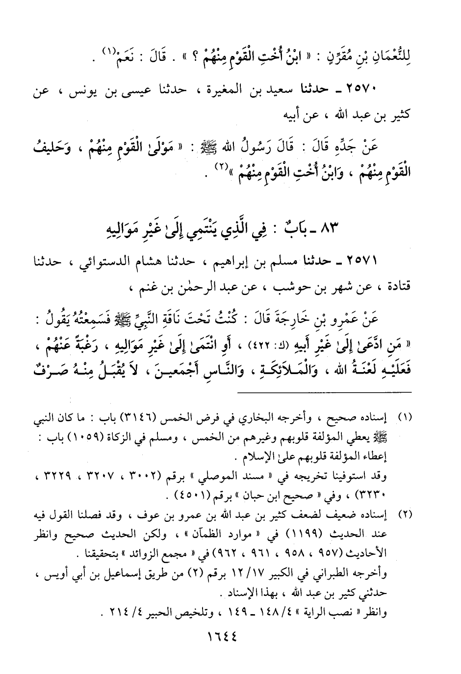 2571 - حَدَّثَنَا مُسْلِمُ بْنُ إِبْرَاهِيمَ، حَدَّثَنَا هِشَامٌ الدَّسْتُوَائِيُّ، حَدَّثَنَا قَتَادَةُ، عَنْ شَهْرِ بْنِ حَوْشَبٍ، عَنْ عَبْدِ الرَّحْمَنِ بْنِ غَنْمٍ، عَنْ عَمْرِو بْنِ خَارِجَةَ، قَالَ: كُنْتُ تَحْتَ نَاقَةِ النَّبِيِّ صَلَّى اللهُ عَلَيْهِ وَسَلَّمَ، فَسَمِعْتُهُ يَقُولُ: «§مَنِ ادَّعَى إِلَى غَيْرِ أَبِيهِ، أَوِ انْتَمَى إِلَى غَيْرِ مَوَالِيهِ، رَغْبَةً عَنْهُمْ، فَعَلَيْهِ لَعْنَةُ اللَّهِ وَالْمَلَائِكَةِ وَالنَّاسِ أَجْمَعِينَ، لَا يُقْبَلُ مِنْهُ صَرْفٌ -[1645]- وَلَا عَدْلٌ» Qإسناده حسن