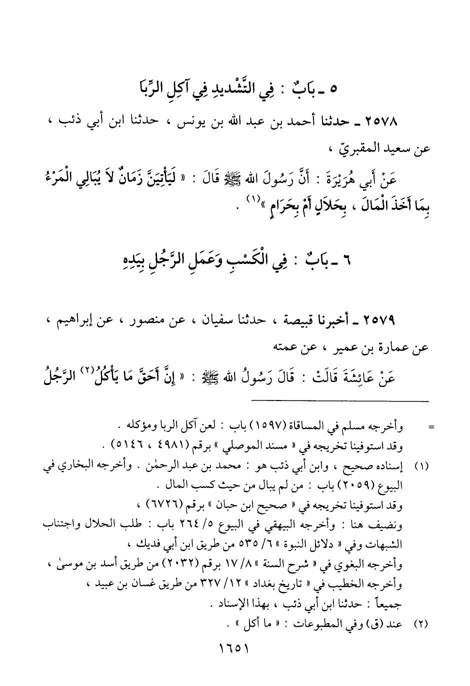 2578 - حَدَّثَنَا أَحْمَدُ بْنُ عَبْدِ اللَّهِ بْنِ يُونُسَ، حَدَّثَنَا ابْنُ أَبِي ذِئْبٍ، عَنْ سَعِيدٍ الْمَقْبُرِيِّ، عَنْ أَبِي هُرَيْرَةَ، أَنَّ رَسُولَ اللَّهِ صَلَّى اللهُ عَلَيْهِ وَسَلَّمَ قَالَ: «§لَيَأْتِيَنَّ زَمَانٌ لَا يُبَالِي الْمَرْءُ بِمَا أَخَذَ الْمَالَ، بِحَلَالٍ أَمْ بِحَرَامٍ» Qإسناده صحيح وابن أبي ذئب هو: محمد بن عبد الرحمن