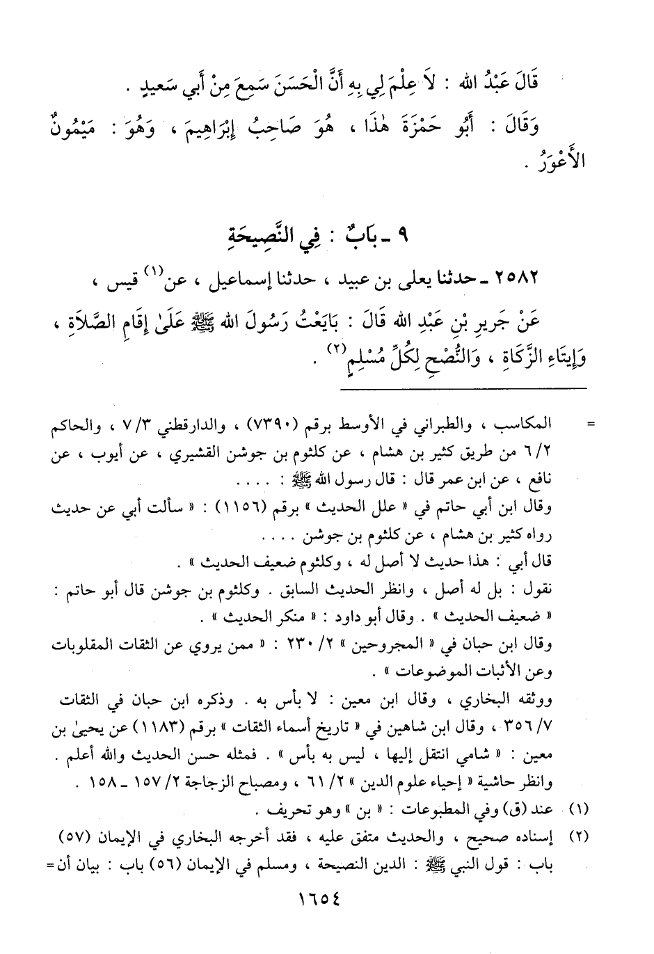 2582 - حَدَّثَنَا يَعْلَى بْنُ عُبَيْدٍ، حَدَّثَنَا إِسْمَاعِيلُ، عَنْ قَيْسٍ، عَنْ جَرِيرِ بْنِ عَبْدِ اللَّهِ، قَالَ: «§بَايَعْتُ رَسُولَ اللَّهِ صَلَّى اللهُ عَلَيْهِ وَسَلَّمَ عَلَى إِقَامِ الصَّلَاةِ، وَإِيتَاءِ الزَّكَاةِ، وَالنُّصْحِ لِكُلِّ مُسْلِمٍ» Qإسناده صحيح والحديث متفق عليه