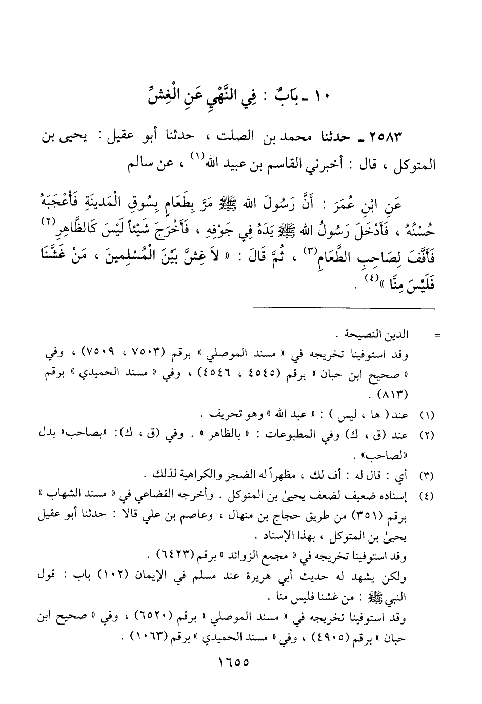 2583 - حَدَّثَنَا مُحَمَّدُ بْنُ الصَّلْتِ، حَدَّثَنَا أَبُو عَقِيلٍ يَحْيَى بْنُ الْمُتَوَكِّلِ، قَالَ: أَخْبَرَنِي الْقَاسِمُ بْنُ عُبَيْدِ اللَّهِ، عَنْ سَالِمٍ، عَنْ ابْنِ عُمَرَ، أَنَّ رَسُولَ اللَّهِ صَلَّى اللهُ عَلَيْهِ وَسَلَّمَ، مَرَّ بِطَعَامٍ بِسُوقِ الْمَدِينَةِ فَأَعْجَبَهُ حُسْنُهُ، فَأَدْخَلَ رَسُولُ اللَّهِ صَلَّى اللهُ عَلَيْهِ وَسَلَّمَ يَدَهُ فِي جَوْفِهِ، فَأَخْرَجَ شَيْئًا لَيْسَ كَالظَّاهِرِ، فَأَفَّفَ لِصَاحِبِ الطَّعَامِ، ثُمَّ قَالَ: «§لَا غِشَّ بَيْنَ الْمُسْلِمِينَ، مَنْ غَشَّنَا فَلَيْسَ مِنَّا» Qإسناده ضعيف لضعف يحيى بن المتوكل