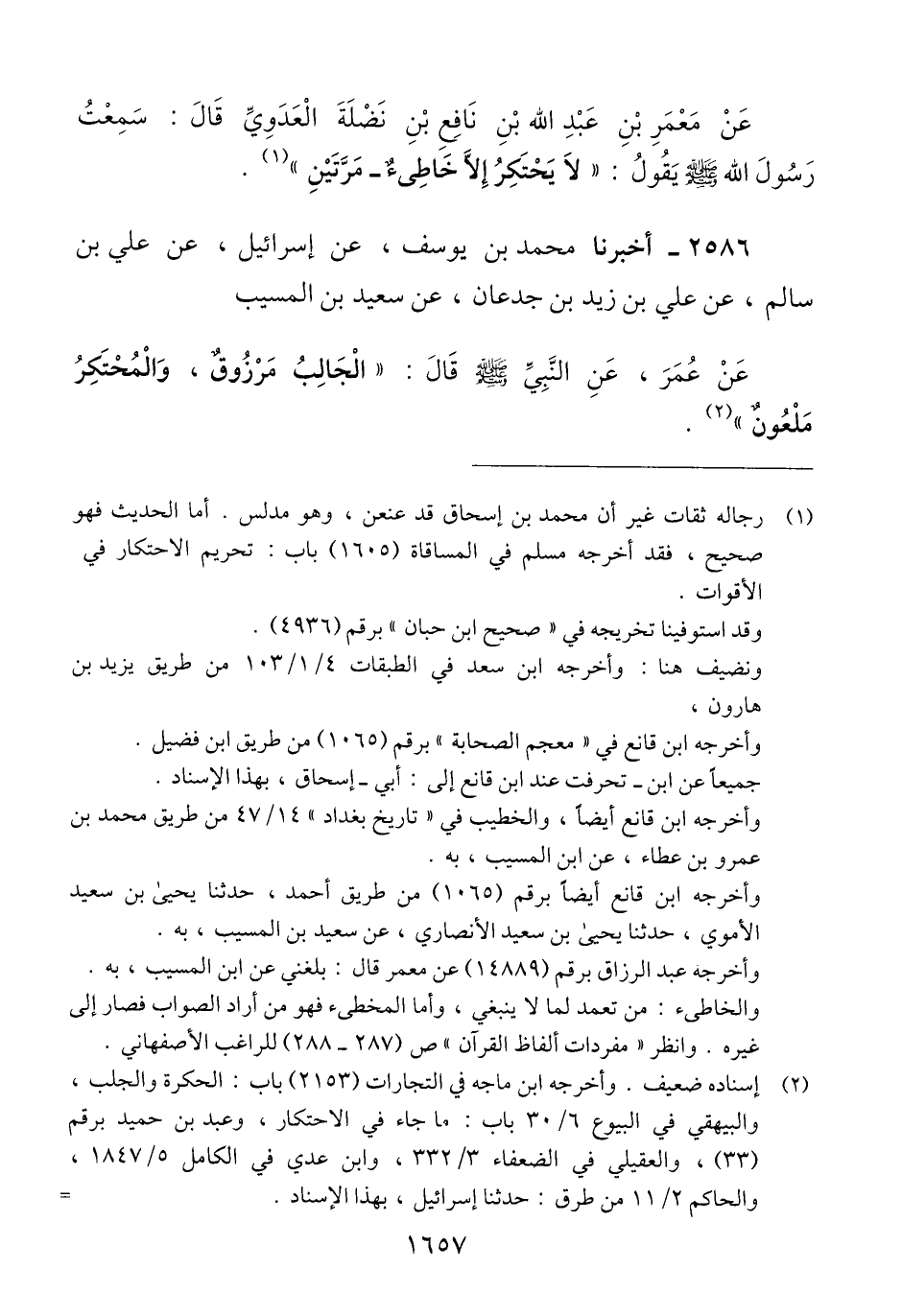 2586 - أَخْبَرَنَا مُحَمَّدُ بْنُ يُوسُفَ، عَنْ إِسْرَائِيلَ، عَنْ عَلِيِّ بْنِ سَالِمٍ، عَنْ عَلِيِّ بْنِ زَيْدِ بْنِ جُدْعَانَ، عَنْ سَعِيدِ بْنِ الْمُسَيِّبِ، عَنْ عُمَرَ، عَنِ النَّبِيِّ صَلَّى اللهُ عَلَيْهِ وَسَلَّمَ قَالَ: «§الْجَالِبُ مَرْزُوقٌ، وَالْمُحْتَكِرُ مَلْعُونٌ» Qإسناده ضعيف
