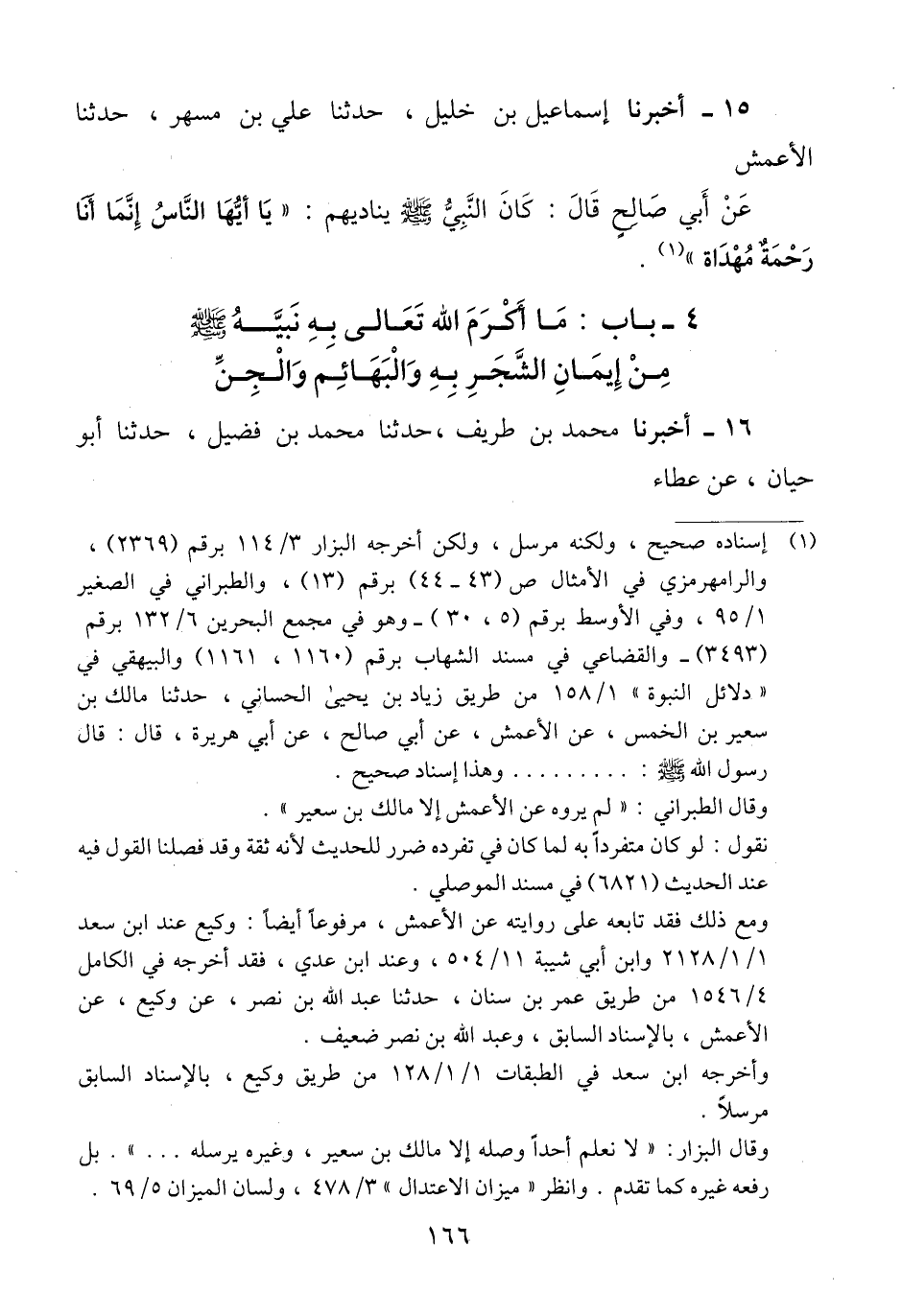 15 - أَخْبَرَنَا إِسْمَاعِيلُ بْنُ خَلِيلٍ، حَدَّثَنَا عَلِيُّ بْنُ مُسْهِرٍ، حَدَّثَنَا الْأَعْمَشُ عَنْ أَبِي صَالِحٍ قَالَ: كَانَ النَّبِيُّ صَلَّى اللهُ عَلَيْهِ وَسَلَّمَ: «§يُنَادِيهِمْ يَا أَيُّهَا النَّاسُ إِنَّمَا أَنَا رَحْمَةٌ مُهْدَاةٌ» Qإسناده صحيح ولكنه مرسل