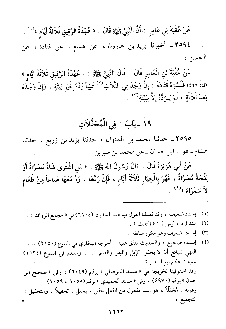 2594 - أَخْبَرَنَا يَزِيدُ بْنُ هَارُونَ، عَنْ هَمَّامٍ، عَنْ قَتَادَةَ، عَنْ الْحَسَنِ، عَنْ عُقْبَةَ بْنِ عَامِرٍ، قَالَ: قَالَ النَّبِيُّ صَلَّى اللهُ عَلَيْهِ وَسَلَّمَ: " §عُهْدَةُ الرَّقِيقِ ثَلَاثَةُ أَيَّامٍ، فَفَسَّرَهُ قَتَادَةُ: «إِنْ وَجَدَ فِي الثَّلَاثِ عَيْبًا رَدَّهُ بِغَيْرِ بَيِّنَةٍ، وَإِنْ وَجَدَهُ بَعْدَ ثَلَاثٍ لَمْ يَرُدَّهُ إِلَّا بِبَيِّنَةٍ» Qإسناده ضعيف وهو مكرر سابقه