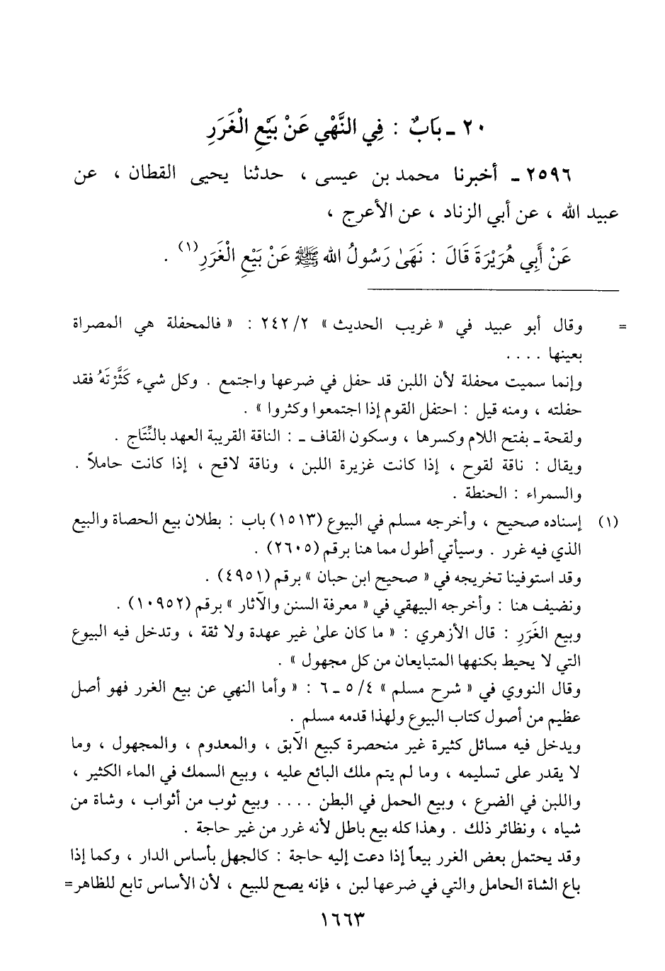 2596 - أَخْبَرَنَا مُحَمَّدُ بْنُ عِيسَى، حَدَّثَنَا يَحْيَى الْقَطَّانُ، عَنْ عُبَيْدِ اللَّهِ، عَنْ أَبِي الزِّنَادِ، عَنْ الْأَعْرَجِ، عَنْ أَبِي هُرَيْرَةَ، قَالَ: «§نَهَى رَسُولُ اللَّهِ صَلَّى اللهُ عَلَيْهِ وَسَلَّمَ، عَنْ بَيْعِ الْغَرَرِ» Qإسناده صحيح