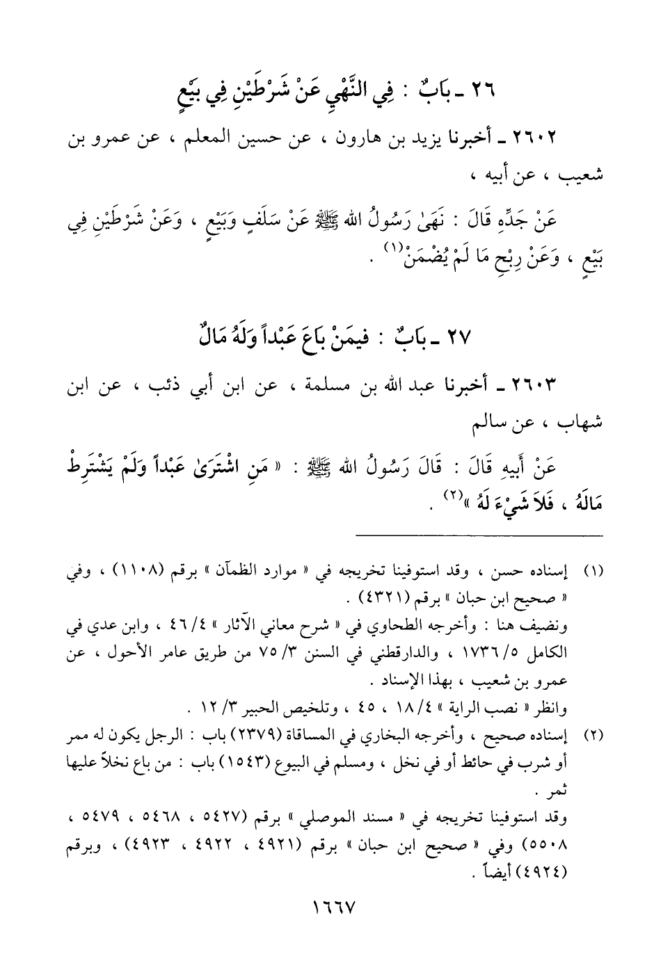 2602 - أَخْبَرَنَا يَزِيدُ بْنُ هَارُونَ، عَنْ حُسَيْنٍ الْمُعَلِّمِ، عَنْ عَمْرِو بْنِ شُعَيْبٍ، عَنْ أَبِيهِ، عَنْ جَدِّهِ، قَالَ: «§نَهَى رَسُولُ اللَّهِ صَلَّى اللهُ عَلَيْهِ وَسَلَّمَ عَنْ سَلَفٍ وَبَيْعٍ، وَعَنْ شَرْطَيْنِ فِي بَيْعٍ، وَعَنْ رِبْحِ مَا لَمْ يُضْمَنْ» Qإسناده حسن