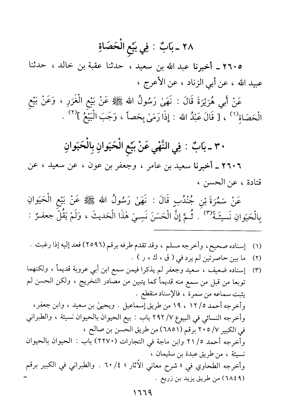 2605 - أَخْبَرَنَا عَبْدُ اللَّهِ بْنُ سَعِيدٍ، حَدَّثَنَا عُقْبَةُ بْنُ خَالِدٍ، حَدَّثَنَا عُبَيْدُ اللَّهِ، عَنْ أَبِي الزِّنَادِ، عَنْ الْأَعْرَجِ، عَنْ أَبِي هُرَيْرَةَ، قَالَ: «§نَهَى رَسُولُ اللَّهِ صَلَّى اللهُ عَلَيْهِ وَسَلَّمَ، عَنْ بَيْعِ الْغَرَرِ، وَعَنْ بَيْعِ الْحَصَاةِ»، قَالَ عَبْد اللَّهِ: «إِذَا رَمَى بِحَصًا وَجَبَ الْبَيْعُ» Qإسناده صحيح