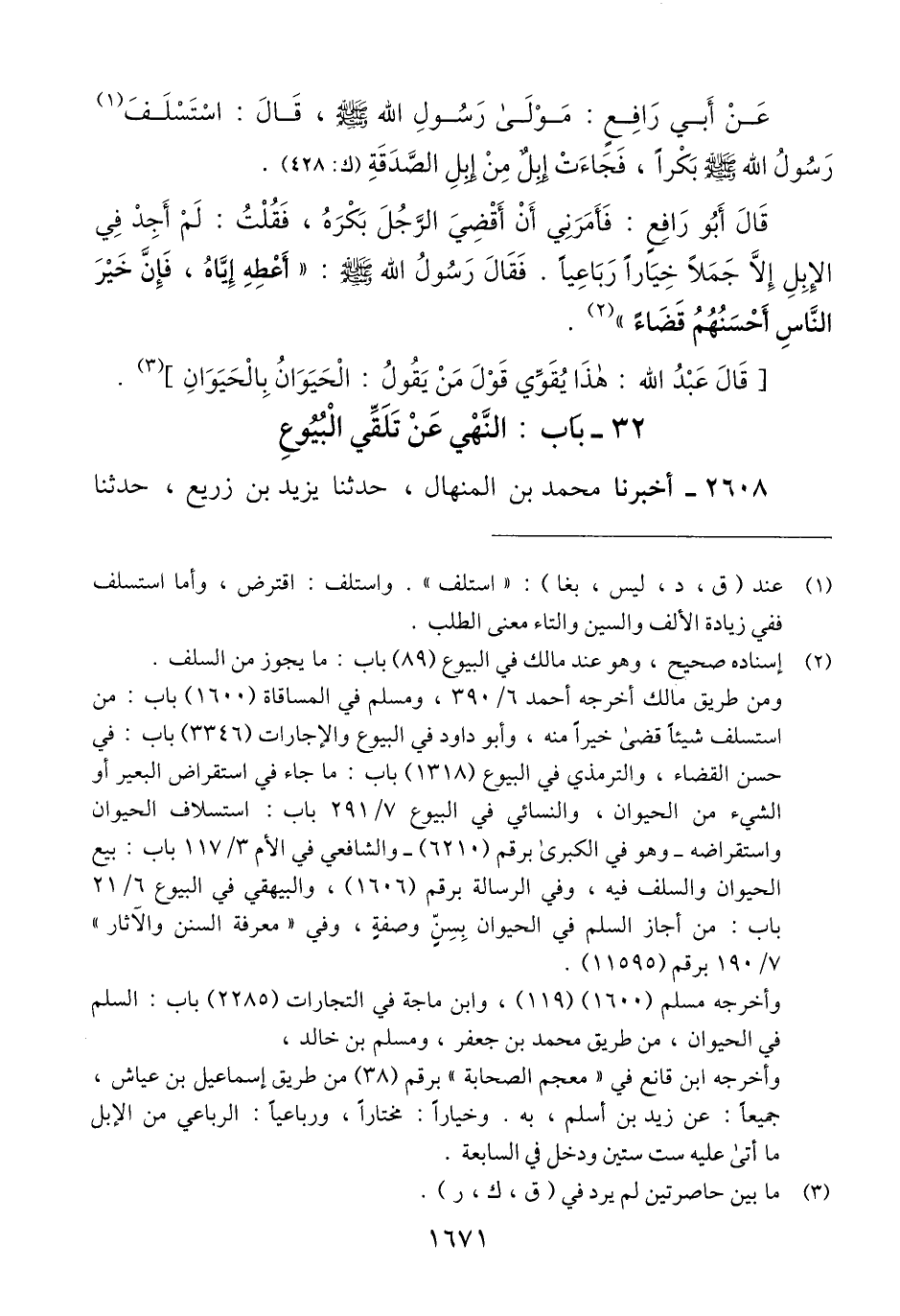2608 - أَخْبَرَنَا مُحَمَّدُ بْنُ الْمِنْهَالِ، حَدَّثَنَا يَزِيدُ بْنُ زُرَيْعٍ، حَدَّثَنَا -[1672]- هِشَامُ بْنُ حَسَّانَ، عَنْ مُحَمَّدٍ، عَنْ أَبِي هُرَيْرَةَ، قَالَ: قَالَ رَسُولُ اللَّهِ صَلَّى اللهُ عَلَيْهِ وَسَلَّمَ: «§لَا تَلَقَّوْا الْجَلَبَ، مَنْ تَلَقَّاهُ فَاشْتَرَى مِنْهُ شَيْئًا فَهُوَ بِالْخِيَارِ إِذَا دَخَلَ السُّوقَ» Qإسناده قوي والحديث متفق عليه