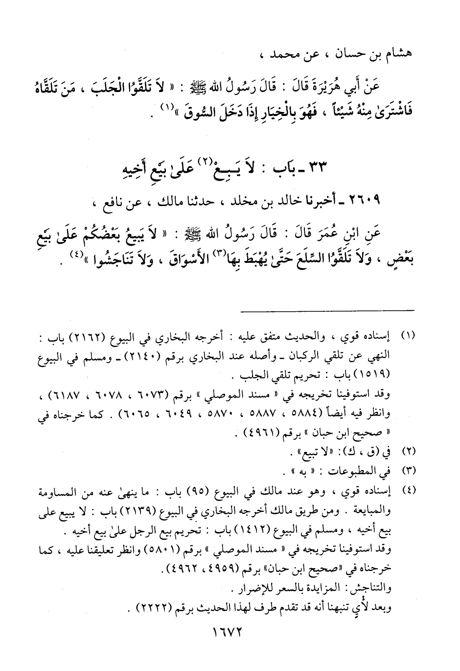 2609 - أَخْبَرَنَا خَالِدُ بْنُ مَخْلَدٍ، حَدَّثَنَا مَالِكٌ، عَنْ نَافِعٍ، عَنْ ابْنِ عُمَرَ، قَالَ: قَالَ رَسُولُ اللَّهِ صَلَّى اللهُ عَلَيْهِ وَسَلَّمَ: «§لَا يَبِيعُ بَعْضُكُمْ عَلَى بَيْعِ بَعْضٍ، وَلَا تَلَقَّوْا السِّلَعَ حَتَّى يُهْبَطَ بِهَا الْأَسْوَاقَ، وَلَا تَنَاجَشُوا» Qإسناده قوي وهو عند مالك في البيوع