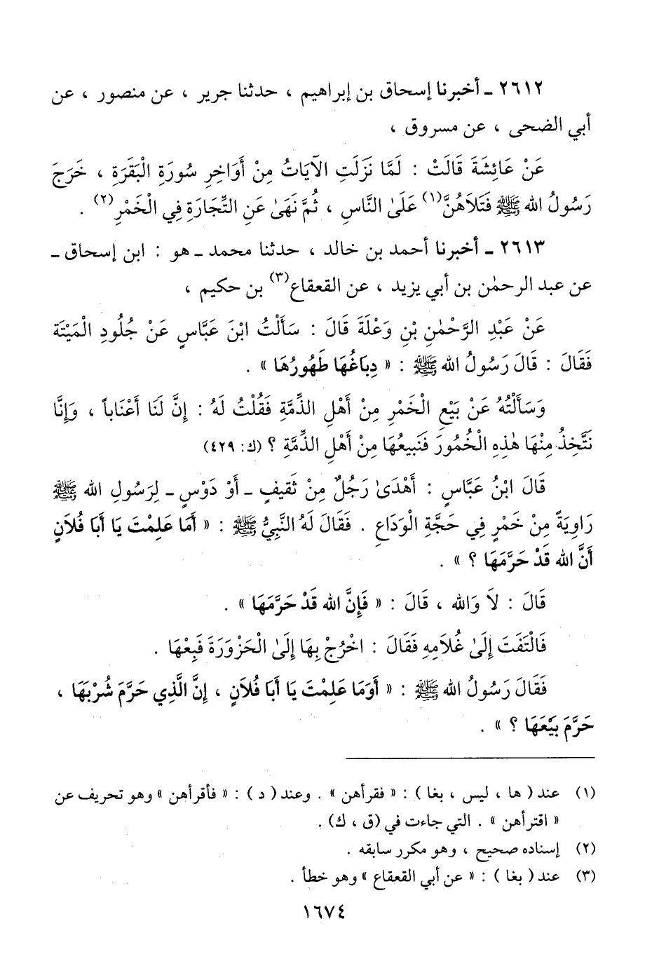 2612 - أَخْبَرَنَا إِسْحَاقُ بْنُ إِبْرَاهِيمَ، حَدَّثَنَا جَرِيرٌ، عَنْ مَنْصُورٍ، عَنْ أَبِي الضُّحَى، عَنْ مَسْرُوقٍ، عَنْ عَائِشَةَ، قَالَتْ: «لَمَّا نَزَلَتِ الْآيَاتُ مِنْ أَوَاخِرِ سُورَةِ الْبَقَرَةِ، خَرَجَ رَسُولُ اللَّهِ صَلَّى اللهُ عَلَيْهِ وَسَلَّمَ فَتَلَاهُنَّ عَلَى النَّاسِ، ثُمَّ §نَهَى عَنِ التِّجَارَةِ فِي الْخَمْرِ» Qإسناده صحيح وهو مكرر سابقه