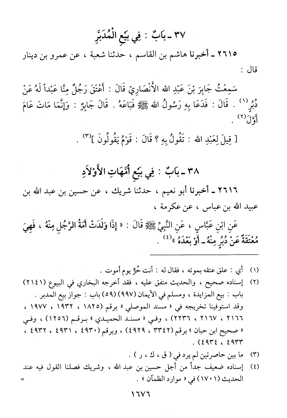 2615 - أَخْبَرَنَا هَاشِمُ بْنُ الْقَاسِمِ، حَدَّثَنَا شُعْبَةُ، عَنْ عَمْرِو بْنِ دِينَارٍ، قَالَ: سَمِعْتُ جَابِرَ بْنَ عَبْدِ اللَّهِ الْأَنْصَارِيَّ، قَالَ: §أَعْتَقَ رَجُلٌ مِنَّا عَبْدًا لَهُ عَنْ دُبُرٍ، قَالَ: «فَدَعَا بِهِ رَسُولُ اللَّهِ صَلَّى اللهُ عَلَيْهِ وَسَلَّمَ، فَبَاعَهُ»، قَالَ جَابِرٌ: وَإِنَّمَا مَاتَ عَامَ أَوَّلَ قِيلَ لِعَبْدِ اللَّهِ: تَقُولُ بِهِ؟ قَالَ: قَوْمٌ يَقُولُونَQإسناده صحيح والحديث متفق عليه