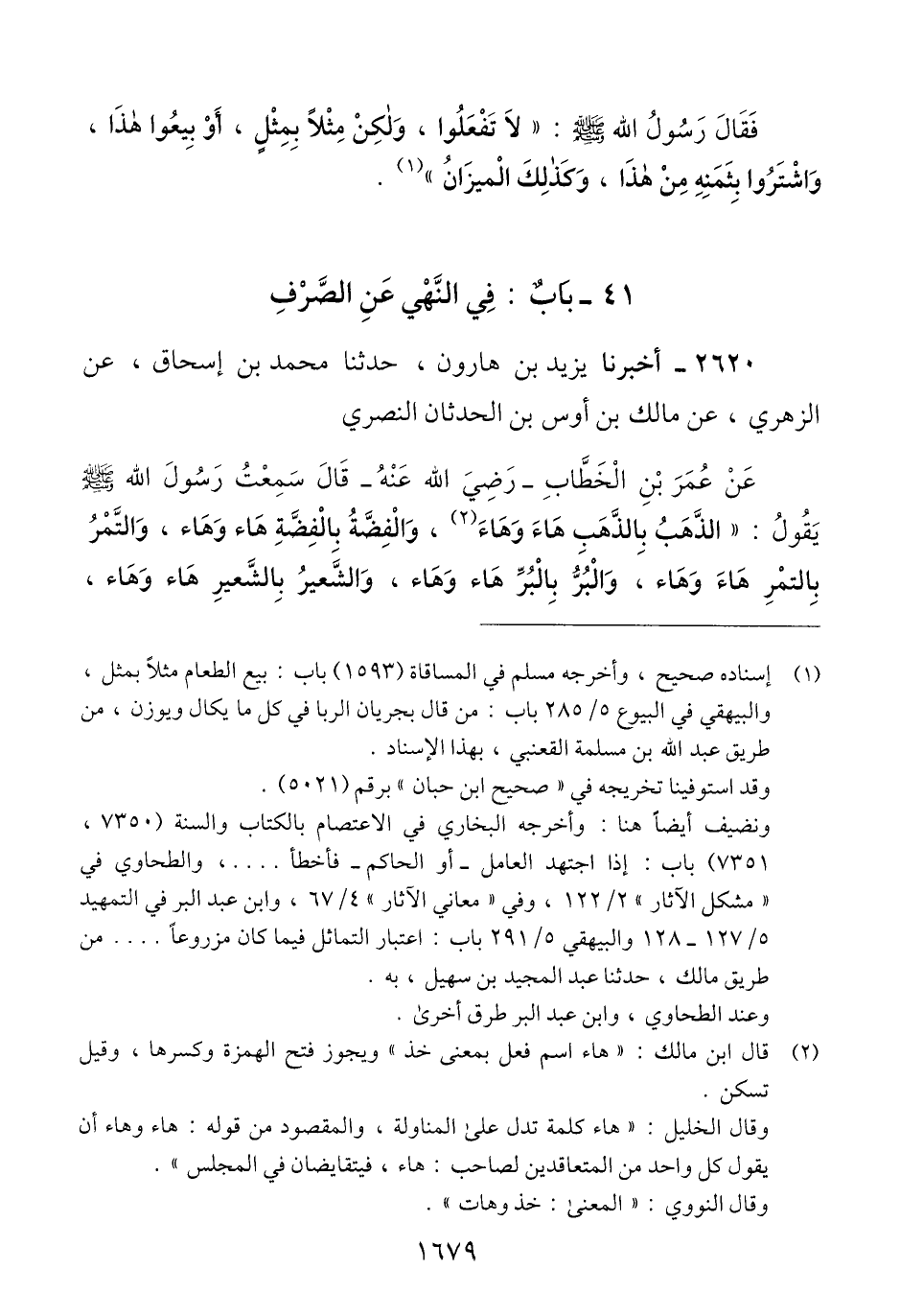 2620 - أَخْبَرَنَا يَزِيدُ بْنُ هَارُونَ، حَدَّثَنَا مُحَمَّدُ بْنُ إِسْحَاقَ، عَنْ الزُّهْرِيِّ، عَنْ مَالِكِ بْنِ أَوْسِ بْنِ الْحَدَثَانِ النَّصْرِيِّ، عَنْ عُمَرَ بْنِ الْخَطَّابِ رَضِيَ اللَّهُ عَنْهُ، قَالَ: سَمِعْتُ رَسُولَ اللَّهِ صَلَّى اللهُ عَلَيْهِ وَسَلَّمَ يَقُولُ: «§الذَّهَبُ بِالذَّهَبِ هَاءَ وَهَاءَ، وَالْفِضَّةُ بِالْفِضَّةِ هَاءَ وَهَاءَ، وَالتَّمْرُ بِالتَّمْرِ هَاءَ وَهَاءَ، وَالْبُرُّ بِالْبُرِّ هَاءَ وَهَاءَ، وَالشَّعِيرُ بِالشَّعِيرِ هَاءَ وَهَاءَ، -[1680]- وَلَا فَضْلَ بَيْنَهُمَا» Qرجاله ثقات ولكن ابن إسحاق قد عنعن وهو مدلس. ولكن الحديث متفق عليه