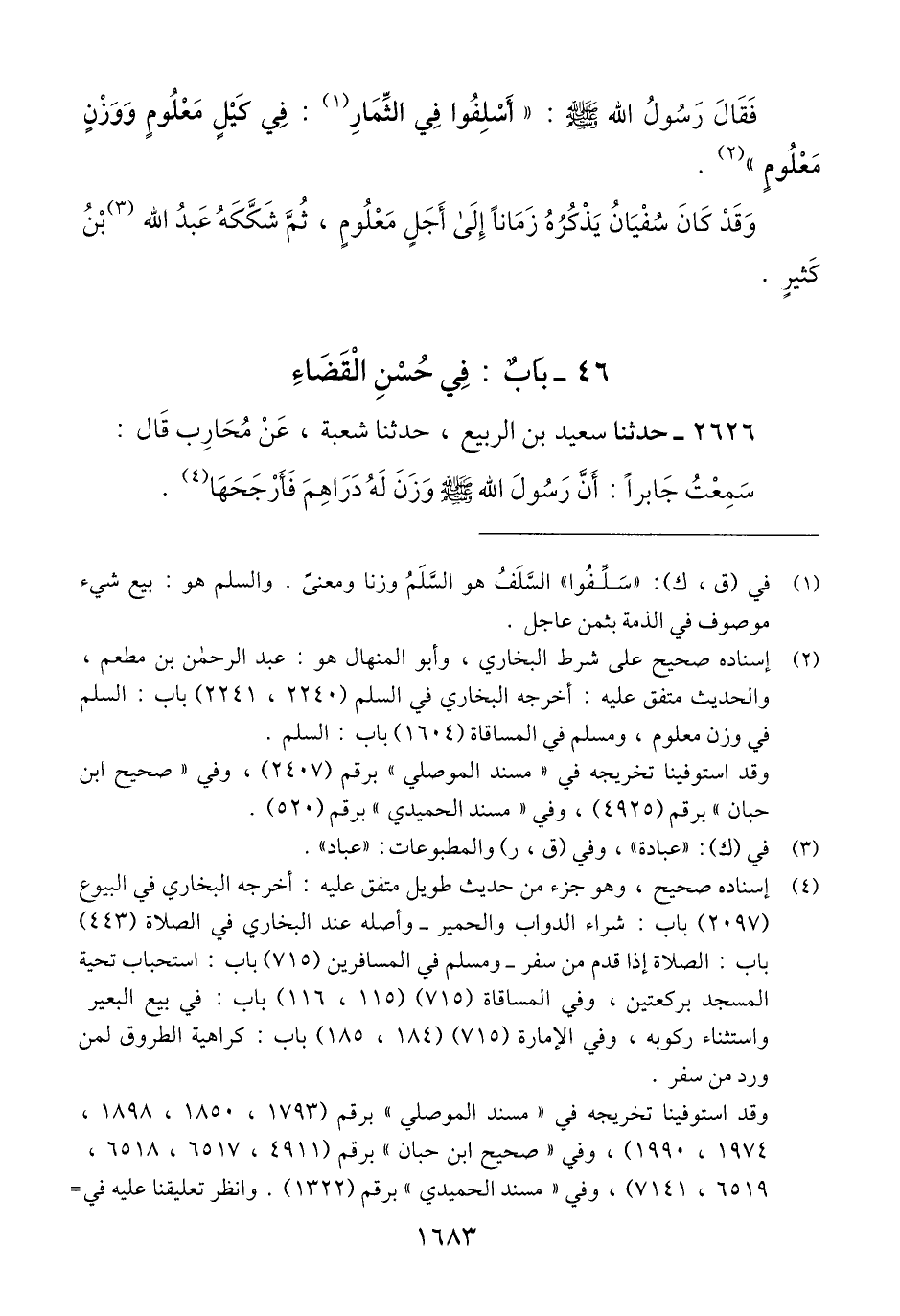 2626 - حَدَّثَنَا سَعِيدُ بْنُ الرَّبِيعِ، حَدَّثَنَا شُعْبَةُ، عَنْ مُحَارِبٍ، قَالَ: سَمِعْتُ جَابِرًا، أَنَّ رَسُولَ اللَّهِ صَلَّى اللهُ عَلَيْهِ وَسَلَّمَ: «§وَزَنَ لَهُ دَرَاهِمَ، فَأَرْجَحَهَا» Qإسناده صحيح وهو جزء من حديث طويل متفق عليه