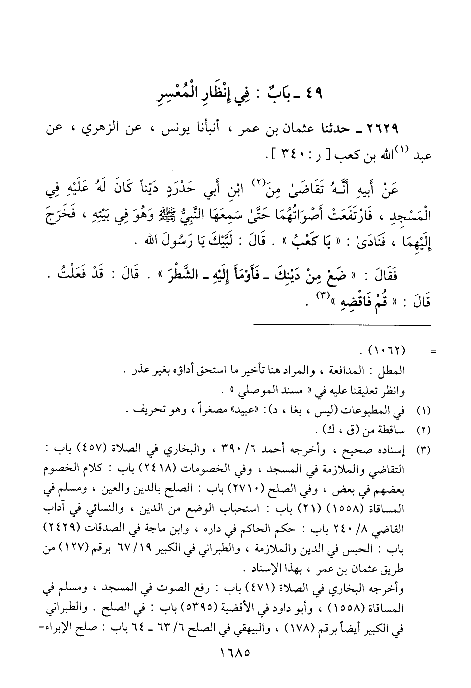 2629 - حَدَّثَنَا عُثْمَانُ بْنُ عُمَرَ، أَنْبَأَنَا يُونُسُ، عَنْ الزُّهْرِيِّ، عَنْ عَبْدِ اللَّهِ بْنِ كَعْبٍ، عَنْ أَبِيهِ، أَنَّهُ تَقَاضَى مِنَ ابْنِ أَبِي حَدْرَدٍ دَيْنًا كَانَ لَهُ عَلَيْهِ فِي الْمَسْجِدِ، فَارْتَفَعَتْ أَصْوَاتُهُمَا حَتَّى سَمِعَهَا النَّبِيُّ صَلَّى اللهُ عَلَيْهِ وَسَلَّمَ وَهُوَ فِي بَيْتِهِ، فَخَرَجَ إِلَيْهِمَا فَنَادَى: «يَا كَعْبُ» قَالَ: لَبَّيْكَ يَا رَسُولَ اللَّهِ، فَقَالَ: «§ضَعْ مِنْ دَيْنِكَ - فَأَوْمَأَ إِلَيْهِ - أَيِ الشَّطْرَ»، قَالَ: قَدْ فَعَلْتُ، قَالَ: «قُمْ فَاقْضِهِ» Qإسناده صحيح