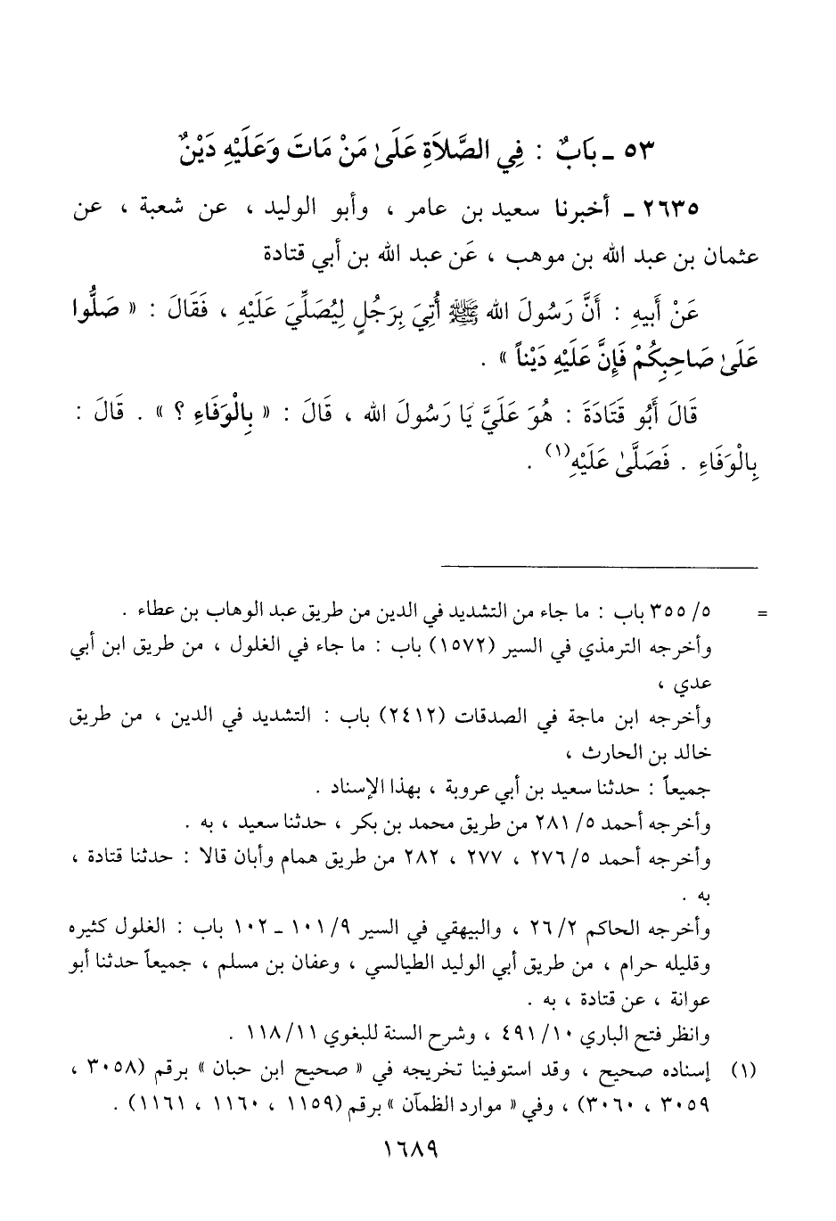 2635 - أَخْبَرَنَا سَعِيدُ بْنُ عَامِرٍ، وَأَبُو الْوَلِيدِ، عَنْ شُعْبَةَ، عَنْ عُثْمَانَ بْنِ عَبْدِ اللَّهِ بْنِ مَوْهَبٍ، عَنْ عَبْدِ اللَّهِ بْنِ أَبِي قَتَادَةَ، عَنْ أَبِيهِ، أَنَّ رَسُولَ اللَّهِ صَلَّى اللهُ عَلَيْهِ وَسَلَّمَ، أُتِيَ بِرَجُلٍ لِيُصَلِّيَ عَلَيْهِ، فَقَالَ: «§صَلُّوا عَلَى صَاحِبِكُمْ فَإِنَّ عَلَيْهِ دَيْنًا»، قَالَ أَبُو قَتَادَةَ: هُوَ عَلَيَّ يَا رَسُولَ اللَّهِ، قَالَ: «بِالْوَفَاءِ؟»، قَالَ: بِالْوَفَاءِ، قَالَ: فَصَلَّى عَلَيْهِQإسناده صحيح