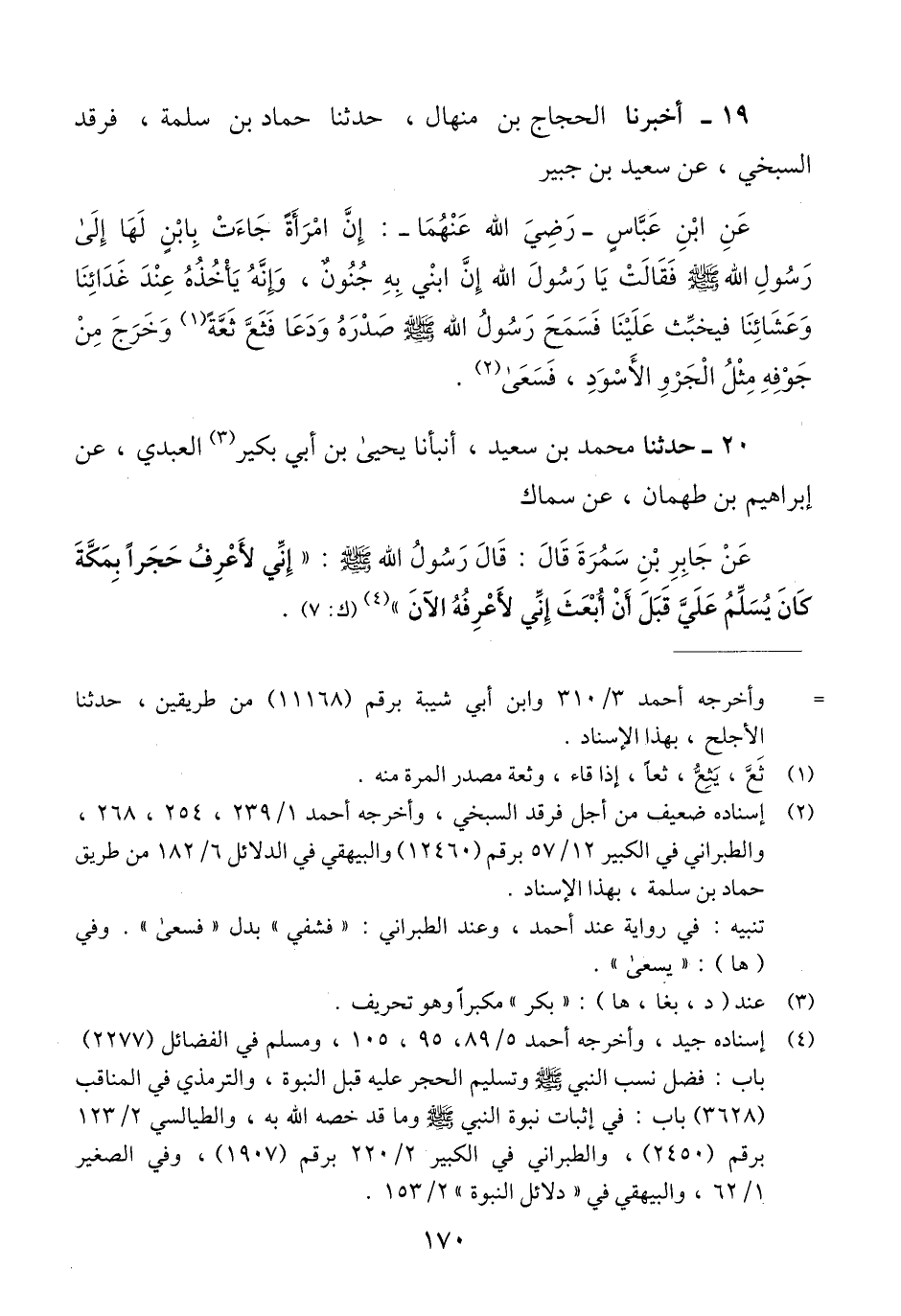 20 - حَدَّثَنَا مُحَمَّدُ بْنُ سَعِيدٍ، أَنْبَأَنَا يَحْيَى بْنُ أَبِي بُكَيْرٍ الْعَبْدِيُّ، عَنْ إِبْرَاهِيمَ بْنِ طَهْمَانَ، عَنْ سِمَاكٍ، عَنْ جَابِرِ بْنِ سَمُرَةَ، قَالَ: قَالَ رَسُولُ اللَّهِ صَلَّى اللهُ عَلَيْهِ وَسَلَّمَ: «§إِنِّي لَأَعْرِفُ حَجَرًا بِمَكَّةَ كَانَ يُسَلِّمُ عَلَيَّ قَبْلَ أَنْ أُبْعَثَ إِنِّي لَأَعْرِفُهُ الْآنَ» Qإسناده جيد
