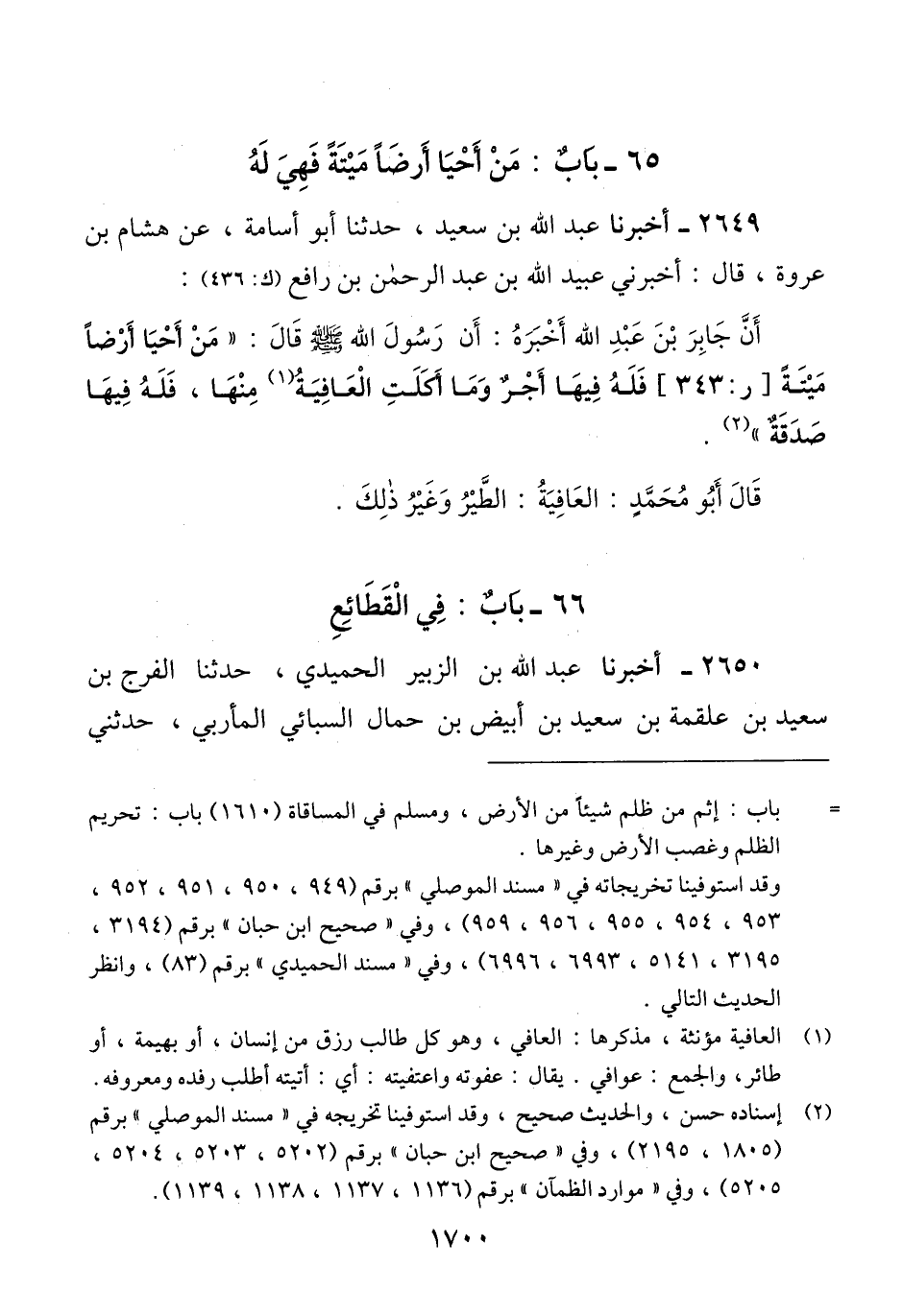 2649 - أَخْبَرَنَا عَبْدُ اللَّهِ بْنُ سَعِيدٍ، حَدَّثَنَا أَبُو أُسَامَةَ، عَنْ هِشَامِ بْنِ عُرْوَةَ، قَالَ: أَخْبَرَنِي عُبَيْدُ اللَّهِ بْنُ عَبْدِ الرَّحْمَنِ بْنِ رَافِعٍ، أَنَّ جَابِرَ بْنَ عَبْدِ اللَّهِ، أَخْبَرَهُ: أَنَّ رَسُولَ اللَّهِ صَلَّى اللهُ عَلَيْهِ وَسَلَّمَ قَالَ: «§مَنْ أَحْيَا أَرْضًا مَيْتَةً فَلَهُ فِيهَا أَجْرٌ وَمَا أَكَلَتِ الْعَافِيَةُ مِنْهَا، فَلَهُ فِيهَا صَدَقَةٌ» قَالَ أَبُو مُحَمَّد: " الْعَافِيَةُ: الطَّيْرُ وَغَيْرُ ذَلِكَ "Qإسناده حسن والحديث صحيح