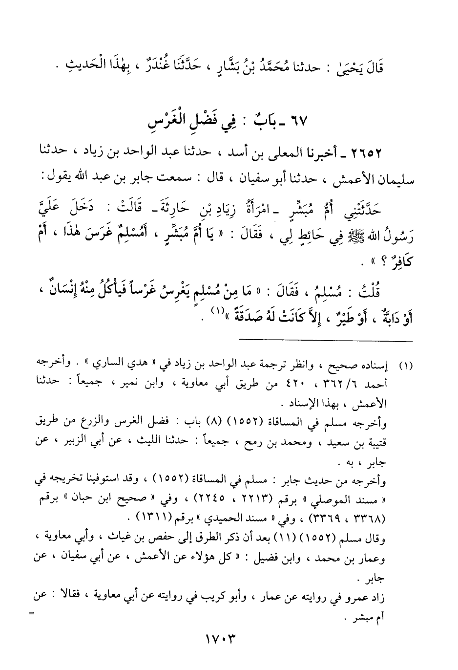 2652 - أَخْبَرَنَا الْمُعَلَّى بْنُ أَسَدٍ، حَدَّثَنَا عَبْدُ الْوَاحِدِ بْنُ زِيَادٍ، حَدَّثَنَا سُلَيْمَانُ الْأَعْمَشُ، حَدَّثَنَا أَبُو سُفْيَانَ، قَالَ: سَمِعْتُ جَابِرَ بْنَ عَبْدِ اللَّهِ، يَقُولُ: حَدَّثَتْنِي أُمُّ مُبَشِّرٍ، امْرَأَةُ زَيْدِ بْنِ حَارِثَةَ، قَالَتْ: دَخَلَ عَلَيَّ رَسُولُ اللَّهِ صَلَّى اللهُ عَلَيْهِ وَسَلَّمَ، فِي حَائِطٍ لِي، فَقَالَ: «يَا أُمَّ مُبَشِّرٍ، أَمُسْلِمٌ غَرَسَ هَذَا، أَمْ كَافِرٌ؟» قُلْتُ: مُسْلِمٌ، فَقَالَ: «§مَا مِنْ مُسْلِمٍ يَغْرِسُ غَرْسًا فَيَأْكُلُ مِنْهُ إِنْسَانٌ، أَوْ دَابَّةٌ، أَوْ طَيْرٌ، إِلَّا كَانَتْ لَهُ صَدَقَةٌ» Qإسناده صحيح