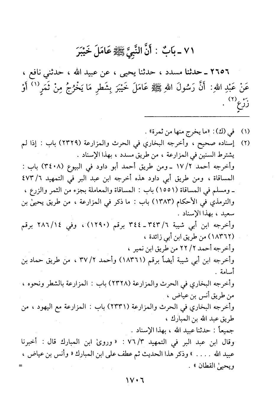 2656 - حَدَّثَنَا مُسَدَّدٌ، حَدَّثَنَا يَحْيَى، عَنْ عُبَيْدِ اللَّهِ، حَدَّثَنِي نَافِعٌ، عَنْ عَبْدِ اللَّهِ: أَنَّ رَسُولَ اللَّهِ صَلَّى اللهُ عَلَيْهِ وَسَلَّمَ، «§عَامَلَ خَيْبَرَ بِشَطْرِ مَا يَخْرُجُ مِنْهَا مِنْ ثَمَرَةٍ أَوْ زَرْعٍ» Qإسناده صحيح