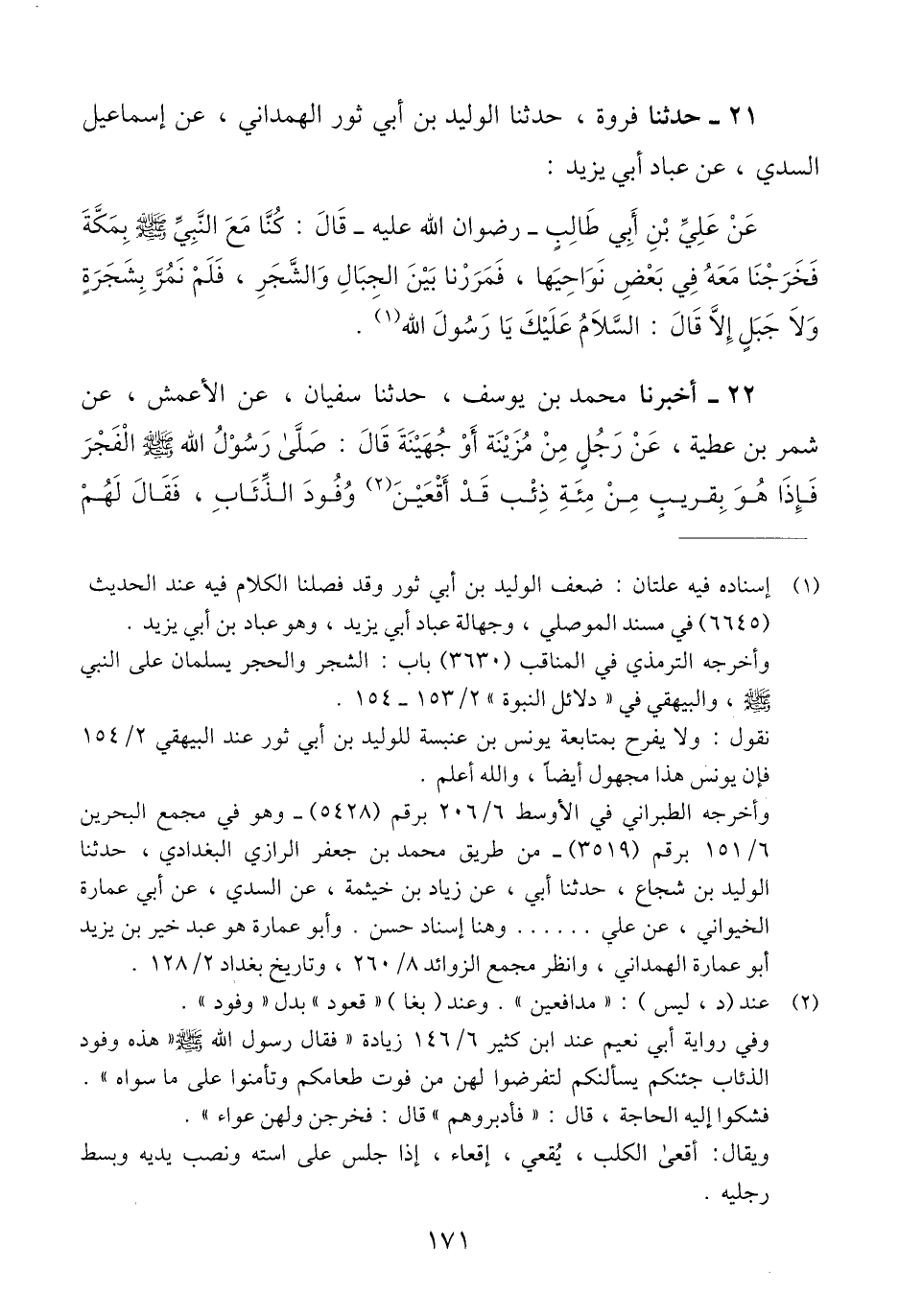 21 - حَدَّثَنَا فَرْوَةُ، حَدَّثَنَا الْوَلِيدُ بْنُ أَبِي ثَوْرٍ الْهَمْدَانِيُّ، عَنْ إِسْمَاعِيلَ السُّدِّيِّ، عَنْ عَبَّادٍ أَبِي يَزِيدَ عَنْ عَلِيِّ بْنِ أَبِي طَالِبٍ رِضْوَانُ اللَّهِ عَلَيْهِ، قَالَ: كُنَّا مَعَ النَّبِيِّ صَلَّى اللَّهُ عليْهِ وَسَلَّمَ بِمَكَّةَ فَخَرَجْنَا مَعَهُ فِي بَعْضِ نَوَاحِيهَا، فَمَرَرْنَا بَيْنَ الْجِبَالِ وَالشَّجَرِ، " §فَلَمْ نَمُرَّ بِشَجَرَةٍ وَلَا جَبَلٍ إِلَّا قَالَ: السَّلَامُ عَلَيْكَ يَا رَسُولَ اللَّهِ "Qإسناده فيه علتان: ضعف الوليد بن أبي ثور وجهالة عباد أبي يزيد وهو عباد بن أبي يزيد