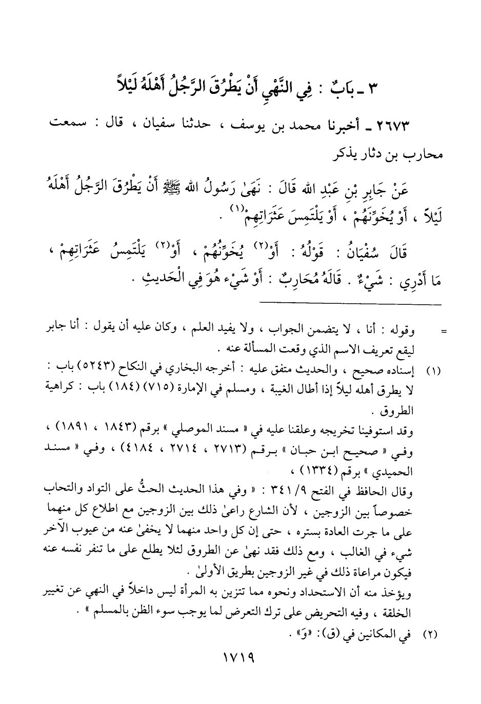 2673 - أَخْبَرَنَا مُحَمَّدُ بْنُ يُوسُفَ، حَدَّثَنَا سُفْيَانُ، قَالَ: سَمِعْتُ مُحَارِبَ بْنَ دِثَارٍ، يَذْكُرُ، عَنْ جَابِرِ بْنِ عَبْدِ اللَّهِ، قَالَ: «§نَهَى رَسُولُ اللَّهِ صَلَّى اللهُ عَلَيْهِ وَسَلَّمَ أَنْ يَطْرُقَ الرَّجُلُ أَهْلَهُ لَيْلًا، أَوْ يُخَوِّنَهُمْ، أَوْ يَلْتَمِسَ عَثَرَاتِهِمْ» قَالَ سُفْيَانُ: " قَوْلُهُ: أَوْ يُخَوِّنَهُمْ، أَوْ يَلْتَمِسَ عَثَرَاتِهِمْ، مَا أَدْرِي: شَيْءٌ قَالَهُ مُحَارِبٌ، أَوْ شَيْءٌ هُوَ فِي الْحَدِيثِ "Qإسناده صحيح والحديث متفق عليه