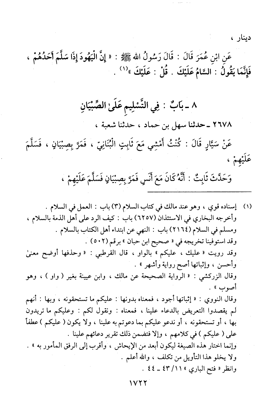 2678 - حَدَّثَنَا سَهْلُ بْنُ حَمَّادٍ، حَدَّثَنَا شُعْبَةُ، عَنْ سَيَّارٍ، قَالَ: كُنْتُ أَمْشِي مَعَ ثَابِتٍ الْبُنَانِيِّ، §فَمَرَّ بِصِبْيَانٍ، فَسَلَّمَ عَلَيْهِمْ، وَحَدَّثَ ثَابِتٌ، أَنَّهُ كَانَ مَعَ أَنَسٍ، فَمَرَّ بِصِبْيَانٍ، فَسَلَّمَ عَلَيْهِمْ، وَحَدَّثَ أَنَسٌ، أَنَّهُ «كَانَ مَعَ النَّبِيِّ صَلَّى اللهُ عَلَيْهِ وَسَلَّمَ، فَمَرَّ بِصِبْيَانٍ، فَسَلَّمَ عَلَيْهِمْ» Qإسناده صحيح