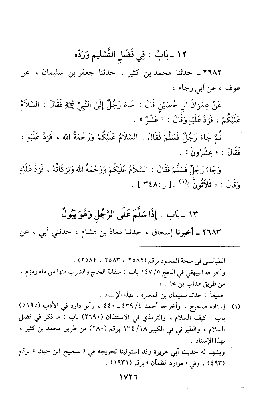2682 - حَدَّثَنَا مُحَمَّدُ بْنُ كَثِيرٍ، حَدَّثَنَا جَعْفَرُ بْنُ سُلَيْمَانَ، عَنْ عَوْفٍ، عَنْ أَبِي رَجَاءٍ، عَنْ عِمْرَانَ بْنِ حُصَيْنٍ، قَالَ: جَاءَ رَجُلٌ إِلَى النَّبِيِّ صَلَّى اللهُ عَلَيْهِ وَسَلَّمَ، فَقَالَ: السَّلَامُ عَلَيْكُمْ، فَرَدَّ عَلَيْهِ وَقَالَ: «§عَشْرٌ». ثُمَّ جَاءَ رَجُلٌ فَسَلَّمَ فَقَالَ: السَّلَامُ عَلَيْكُمْ وَرَحْمَةُ اللَّهِ، فَرَدَّ عَلَيْهِ، فََقَالَ: «عِشْرُونَ». ثُمَّ جَاءَ رَجُلٌ فَسَلَّمَ فَقَالَ: السَّلَامُ عَلَيْكُمْ وَرَحْمَةُ اللَّهِ وَبَرَكَاتُهُ، فَرَدَّ عَلَيْهِ وَقَالَ: «ثَلَاثُونَ» Qإسناده صحيح