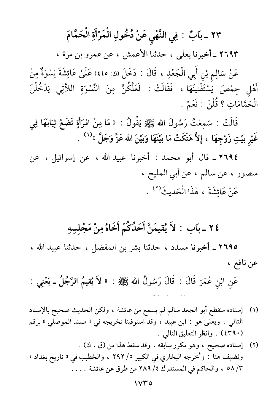 2693 - أَخْبَرَنَا يَعْلَى، حَدَّثَنَا الْأَعْمَشُ، عَنْ عَمْرِو بْنِ مُرَّةَ، عَنْ سَالِمِ بْنِ أَبِي الْجَعْدِ، قَالَ: دَخَلَ عَلَى عَائِشَةَ، نِسْوَةٌ مِنْ أَهْلِ حِمْصٍ يَسْتَفْتِينَهَا، فَقَالَتْ: لَعَلَّكُنَّ مِنَ النِّسْوَةِ اللَّاتِي يَدْخُلْنَ الْحَمَّامَاتِ؟ قُلْنَ: نَعَمْ. قَالَتْ: سَمِعْتُ رَسُولَ اللَّهِ صَلَّى اللهُ عَلَيْهِ وَسَلَّمَ يَقُولُ: «§مَا مِنَ امْرَأَةٍ تَضَعُ ثِيَابَهَا فِي غَيْرِ بَيْتِ زَوْجِهَا، إِلَّا هَتَكَتْ مَا بَيْنَهَا وَبَيْنَ اللَّهِ عَزَّ وَجَلَّ» Qإسناده منقطع أبو الجعد سالم لم يسمع من عائشة ولكن الحديث صحيح بالإسناد التالي. ويعلى هو: ابن عبيد