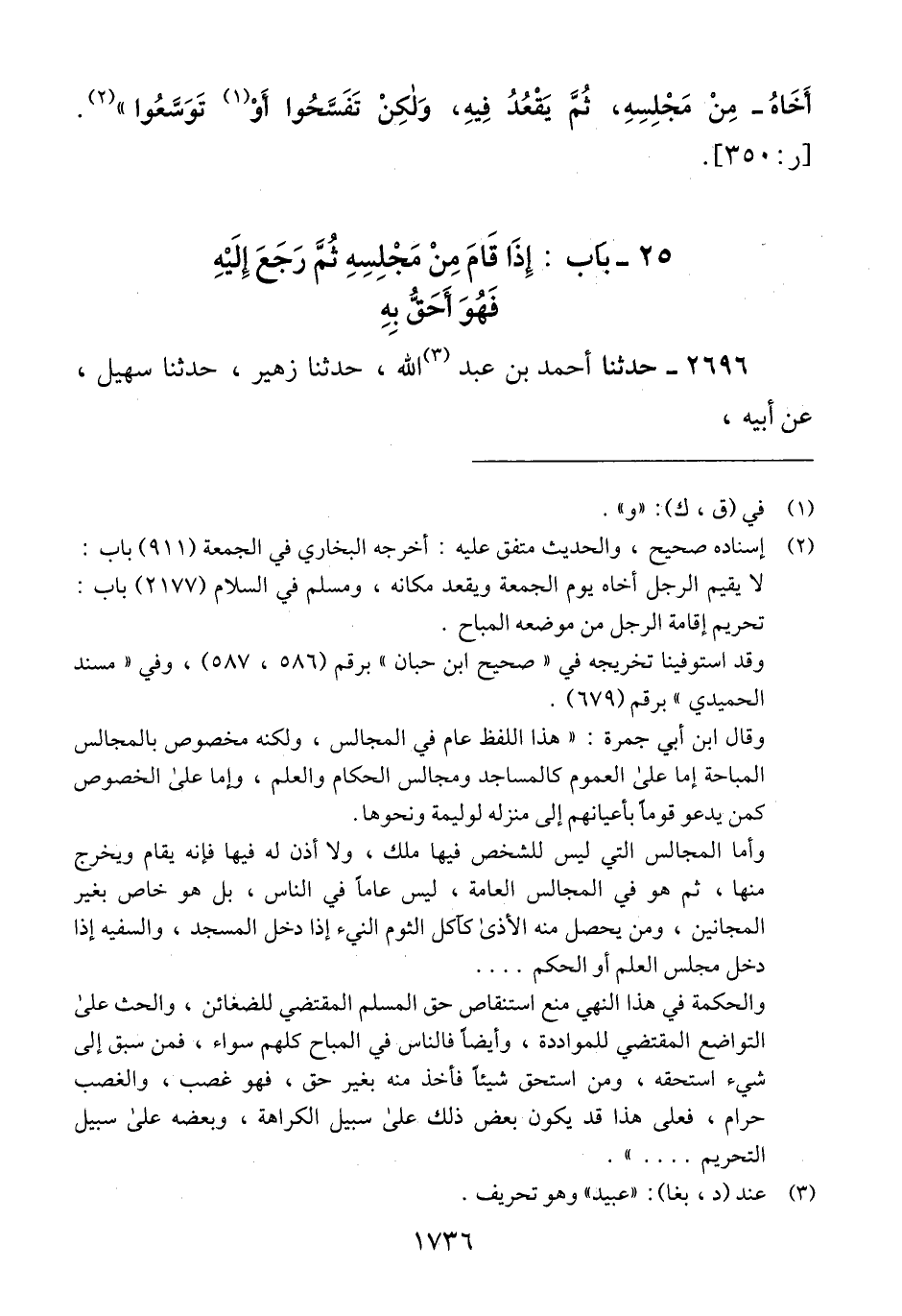 2696 - حَدَّثَنَا أَحْمَدُ بْنُ عَبْدِ اللَّهِ، حَدَّثَنَا زُهَيْرٌ، حَدَّثَنَا سُهَيْلٌ، عَنْ أَبِيهِ، -[1737]- عَنْ أَبِي هُرَيْرَةَ، قَالَ: قَالَ رَسُولُ اللَّهِ صَلَّى اللهُ عَلَيْهِ وَسَلَّمَ: «§إِذَا قَامَ أَحَدُكُمْ - أَوِ الرَّجُلُ - مِنْ مَجْلِسِهِ، ثُمَّ رَجَعَ إِلَيْهِ، فَهُوَ أَحَقُّ بِهِ» Qإسناده صحيح