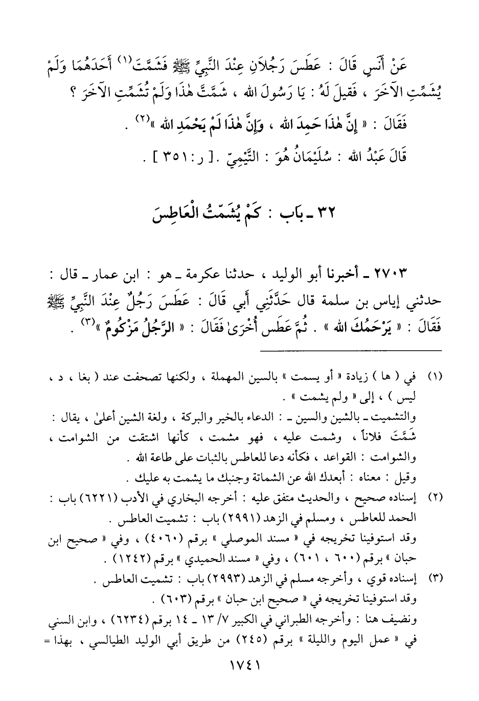 2703 - أَخْبَرَنَا أَبُو الْوَلِيدِ، حَدَّثَنَا عِكْرِمَةُ هُوَ ابْنُ عَمَّارٍ، قَالَ: حَدَّثَنِي إِيَاسُ بْنُ سَلَمَةَ، قَالَ: حَدَّثَنِي أَبِي، قَالَ: عَطَسَ رَجُلٌ عِنْدَ النَّبِيِّ صَلَّى اللهُ عَلَيْهِ وَسَلَّمَ، فَقَالَ: «§يَرْحَمُكَ اللَّهُ». ثُمَّ عَطَسَ أُخْرَى فَقَالَ: «الرَّجُلُ مَزْكُومٌ» Qإسناده قوي