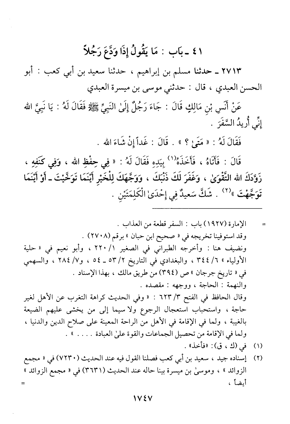 2713 - حَدَّثَنَا مُسْلِمُ بْنُ إِبْرَاهِيمَ، حَدَّثَنَا سَعِيدُ بْنُ أَبِي كَعْبٍ أَبُو الْحَسَنِ الْعَبْدِيُّ، قَالَ: حَدَّثَنِي مُوسَى بْنُ مَيْسَرَةَ الْعَبْدِيُّ، عَنْ أَنَسِ بْنِ مَالِكٍ، قَالَ: جَاءَ رَجُلٌ إِلَى النَّبِيِّ صَلَّى اللهُ عَلَيْهِ وَسَلَّمَ، فَقَالَ لَهُ: يَا نَبِيَّ اللَّهِ، إِنِّي أُرِيدُ السَّفَرَ. فَقَالَ لَهُ: «مَتَى؟» قَالَ: غَدًا إِنْ شَاءَ اللَّهُ. قَالَ: فَأَتَاهُ، فَأَخَذَ بِيَدِهِ، فَقَالَ لَهُ: «§فِي حِفْظِ اللَّهِ، وَفِي كَنَفِهِ، زَوَّدَكَ اللَّهُ التَّقْوَى، وَغَفَرَ لَكَ ذَنْبَكَ، وَوَجَّهَكَ لِلْخَيْرِ أَيْنَمَا تَوَخَّيْتَ، أَوْ أَيْنَمَا تَوَجَّهْتَ» شَكَّ سَعِيدٌ فِي إِحْدَى الْكَلِمَتَيْنِQإسناده جيد